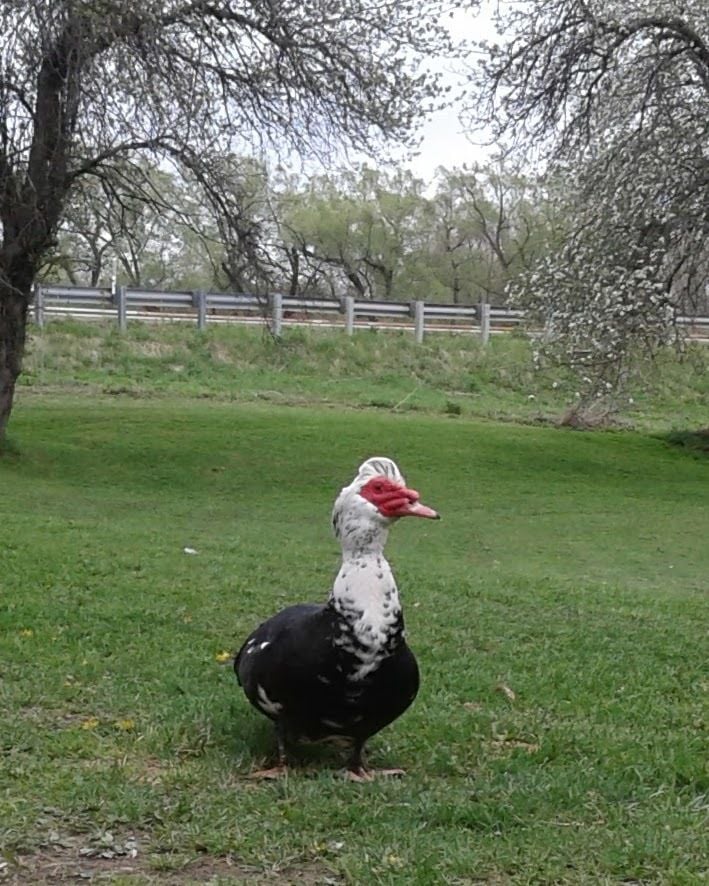 Yesterday I couldn't figure out why one of my hens was still up on the roost when every one else was outside and when I went in I found out my Muscovy female Hope was in the cubby right where my hen had to walk by and she was being Miss Grumpy because she had an egg in there. Poor Mary Anna was scared to go by her.