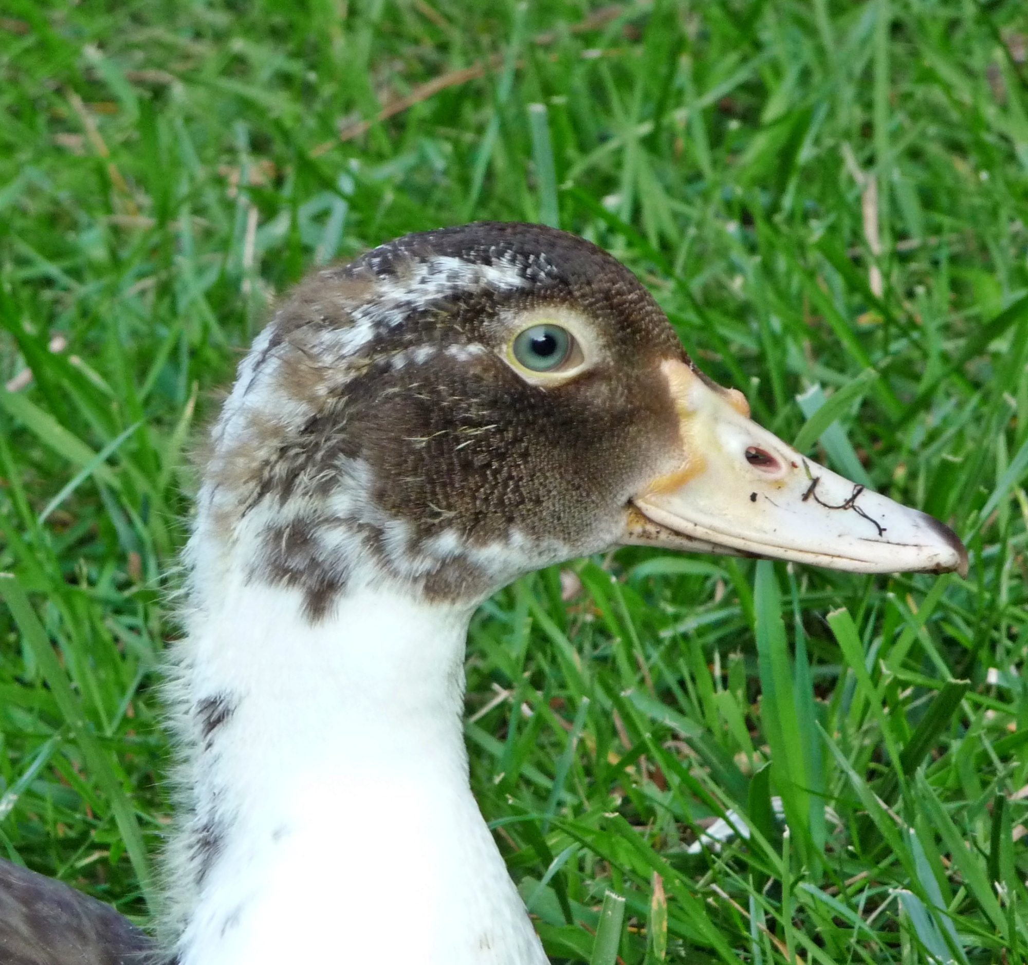 Beautiful, I have never seen that color eyes on a Muscovy before.Do you know if this drakelets eyes will remain green/blue? or will they turn gold/brown as he ages?
