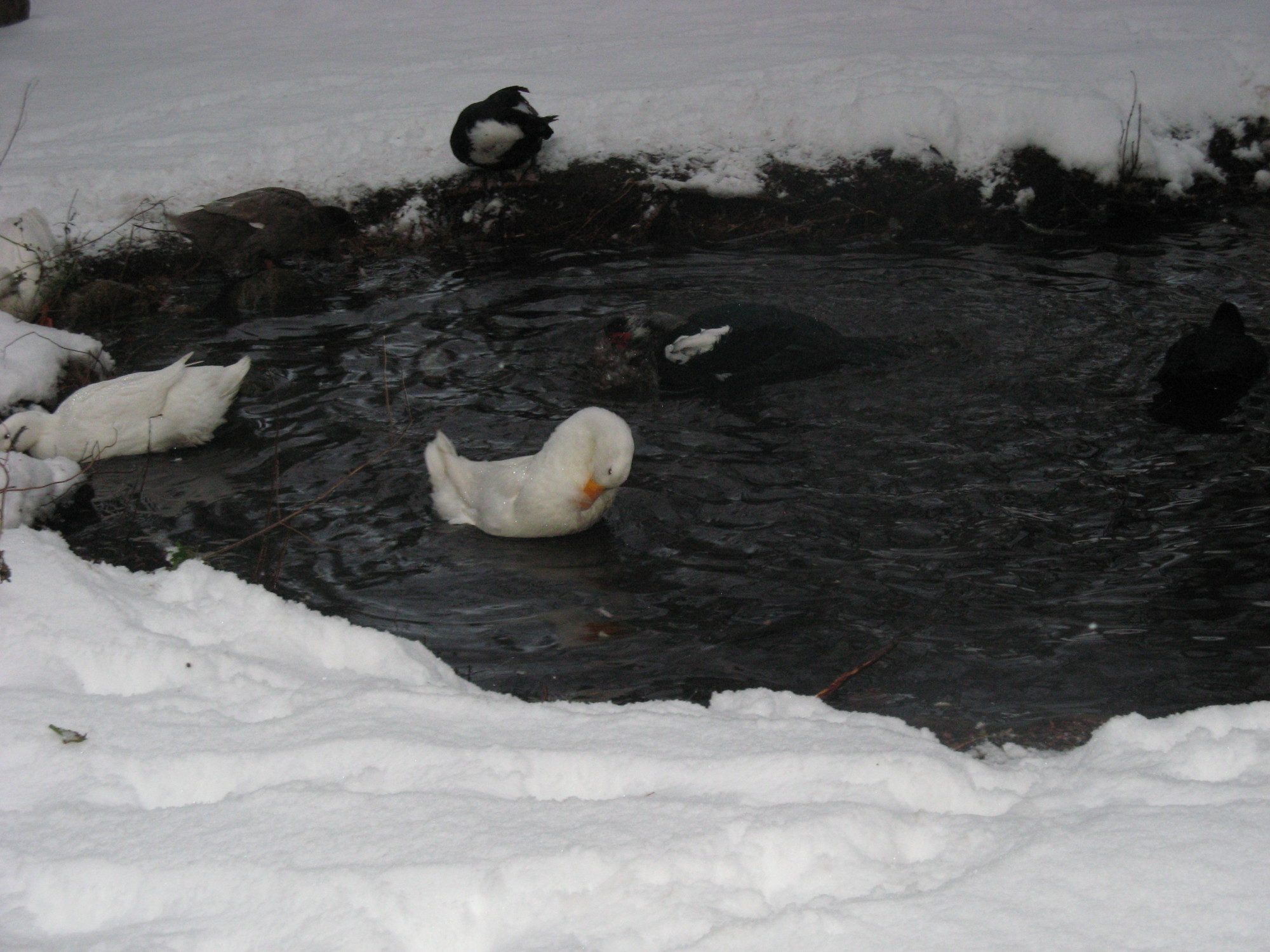 My babies! do not know how to add words between pictures so this will have to do. The bottom picture is of the winterized duckie enclosure. The sweetie with the white tummy is Salt. Darkwing & Flipper are on the perch and the pond ( fed by an artisian well) is where they are taking their baths.POHI is the top picture If you stand too close you get really , really WET