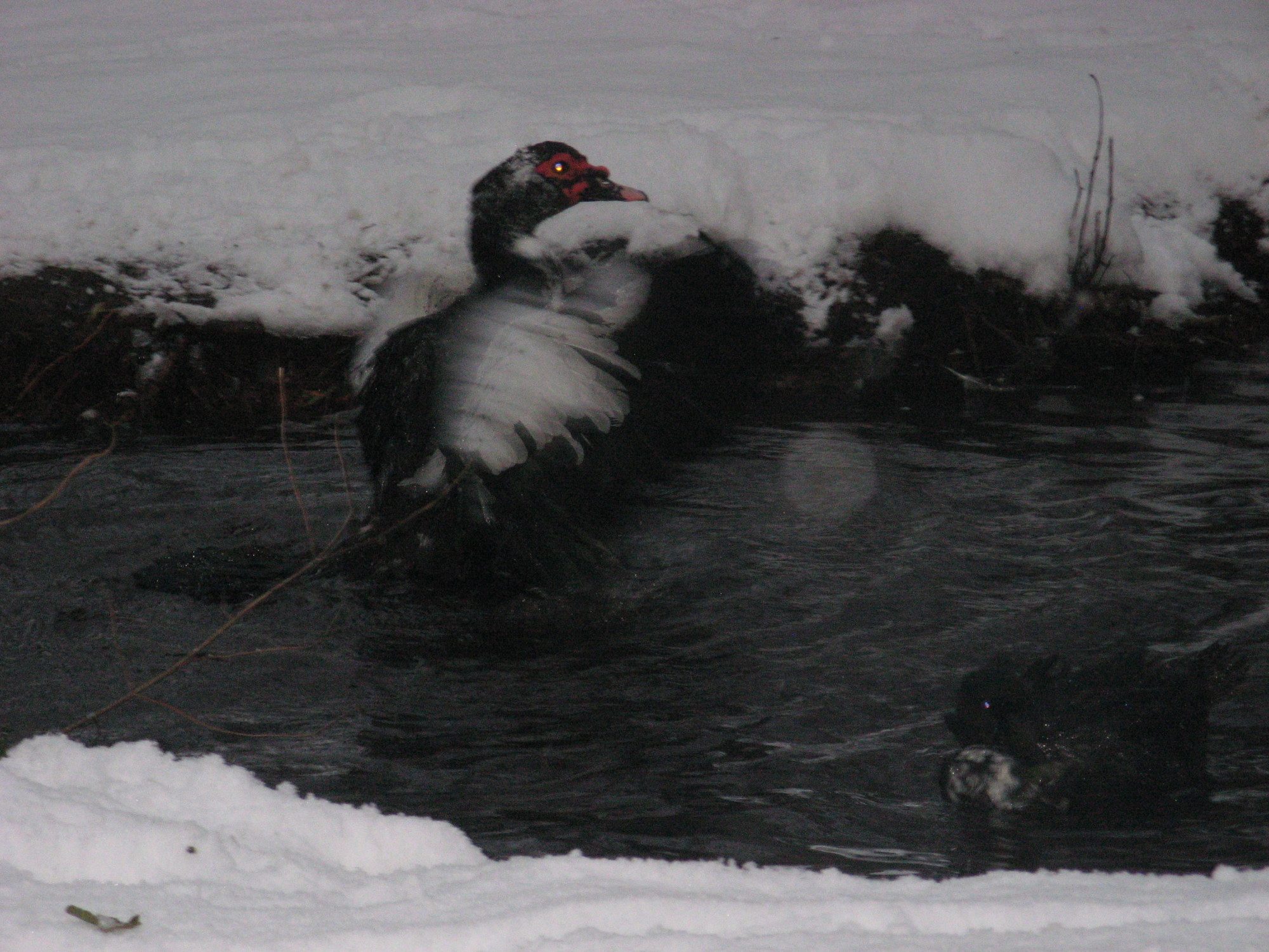 Well, I lost one of the ducks to a coyote last thanksgiving day, and in an attempt to move their pen closer to the house to limit shoveling, I caused the other b/w duck to ignore the duckhouse ( her attitude was that's not our house... our house is over here.... hey what happened to our house... ) she flew under a streetlight ( they do this so they can see if something is coming for them) and was struck during the night, so the least favorite female is now Big Boy's main squeeze.