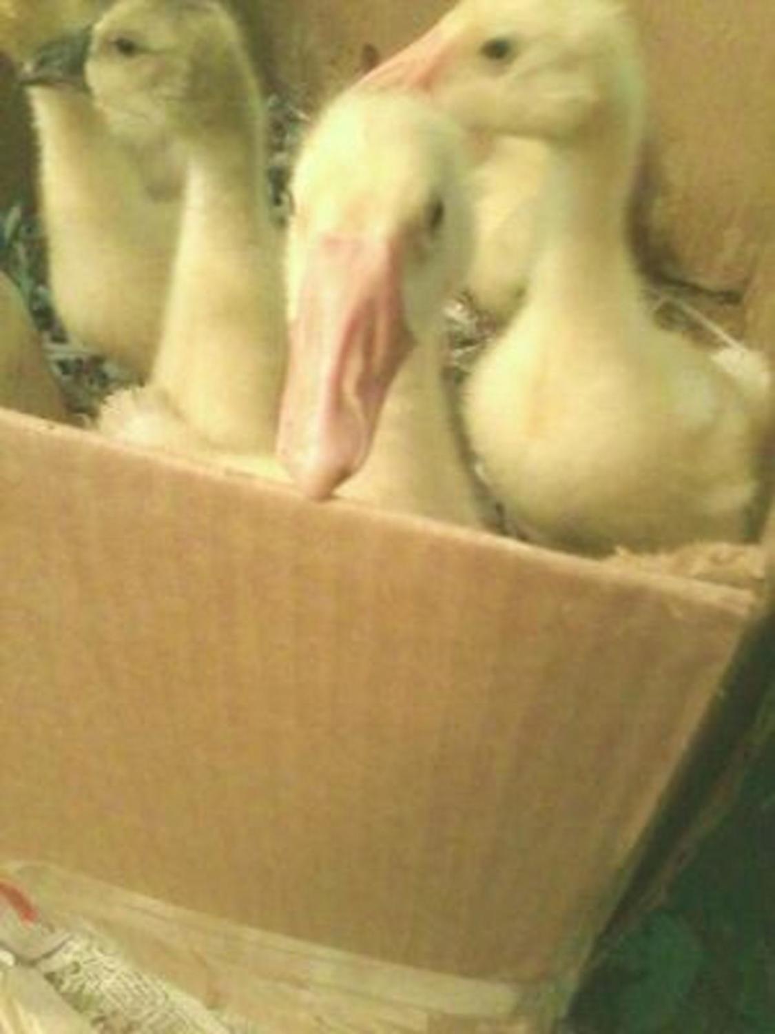 Thank you! I was shocked that they don't quack, but its been a lot of fun raising them. Huey has once, when a guinea cock grabbed her wing, and she promptly bit him! Yes, we sure did get the geese, 2 African, 4 embden. My dominant gander, an Embden is Big G, and Dad is his "pet" or so big G thinks so. If Dad sits on the porch steps, G gets on his lap and no living creature DARES approach them. G will snuggle down and nuzzle his shirt, adorable. We have another gander and 4 goose. My favorite is the African goose WeeWee, she is a lover girl. Same with her, she loves to sit in your lap. She gets very demanding, and will tug your shirt until you pick her up. Here's a baby picture or 4 hehe