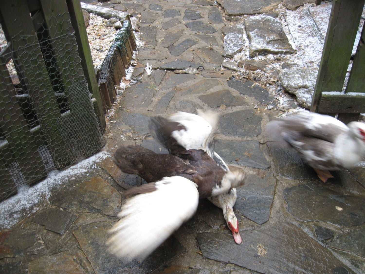 This is what has been going on here today... cat fight I mean duck fights. these 2 are sisters but for some reason they were mad at each other today, the one on top in the pics is in solitary confinement tonight since she sleeps with the one she beat up.