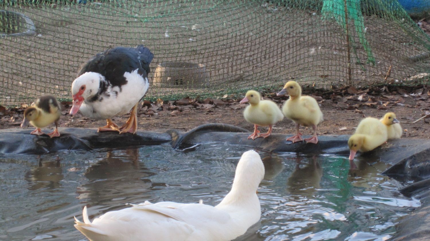 My Pekin drake in the foreground. My adult ducks are peaceful towards the ducklings and barely show any sign of aggression.
