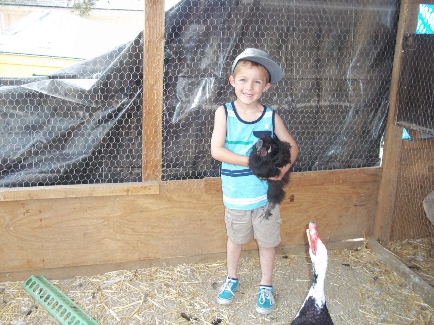 My muscovy Daisy Not liking my Nephew holding the silkie and not giving him love! My drakes thank they are kings of the pen and want all the love when we go out to see them.