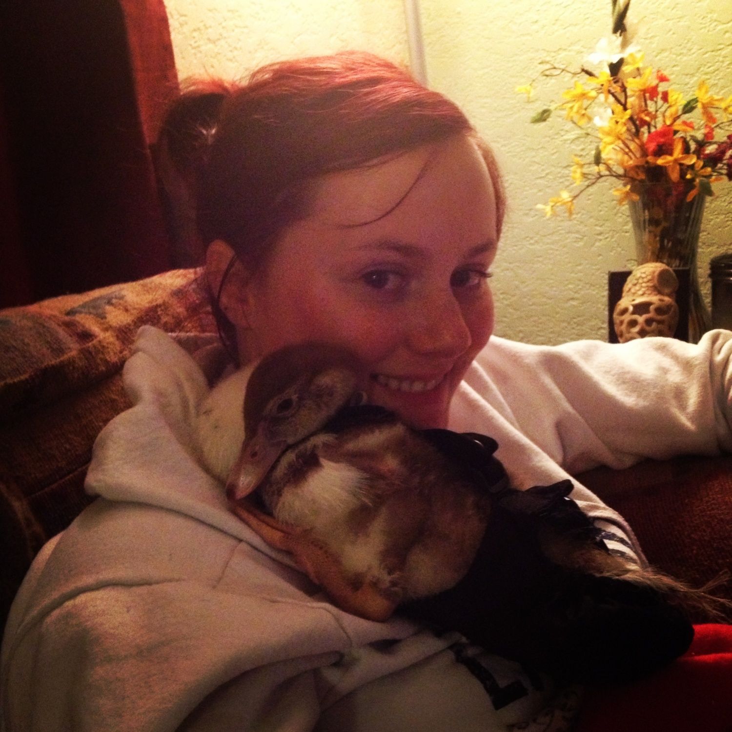 Aww! My youngest daughter (20) fell in love with scovies and got 4 last year. We wound up with 3 ducks: Huey, Donald and Squawk and 1 drake Stanley. They are very sweet birds, just love the tail wags. Its beautiful to watch them fly. Stanley cant get more than 3 feet off the ground, too FAT