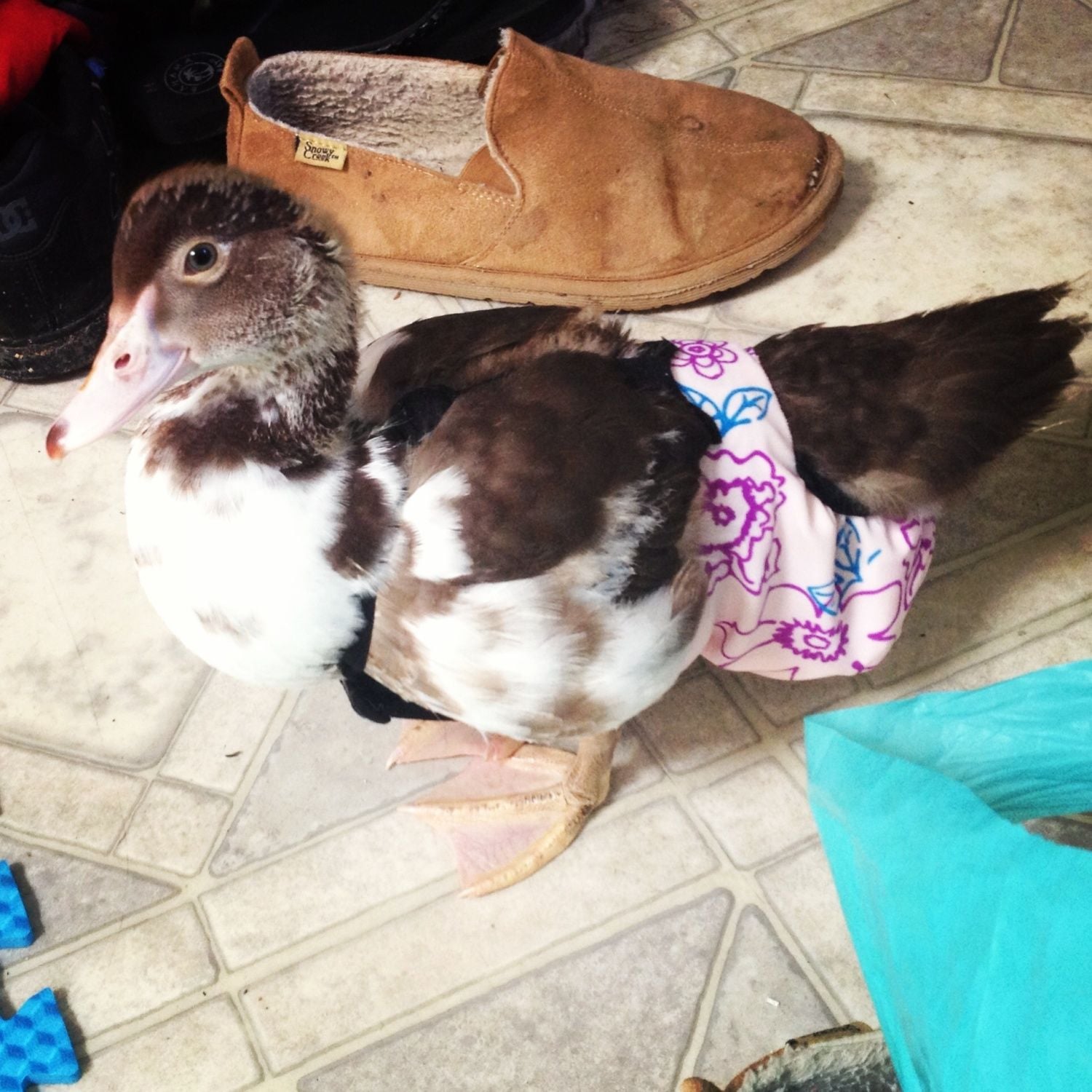 This is my new Muscovy Hen. She needs a name. I "rescued" her from a meat bird farm. She now has the unique opportunity to be a house pet. We finished her indoor enclosure today and I'm working on making her a makeshift diaper until I can afford a good one, She seems fairly calm and isn't afraid of people.
