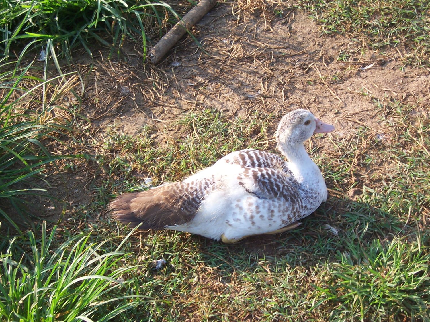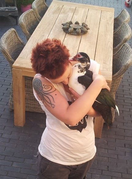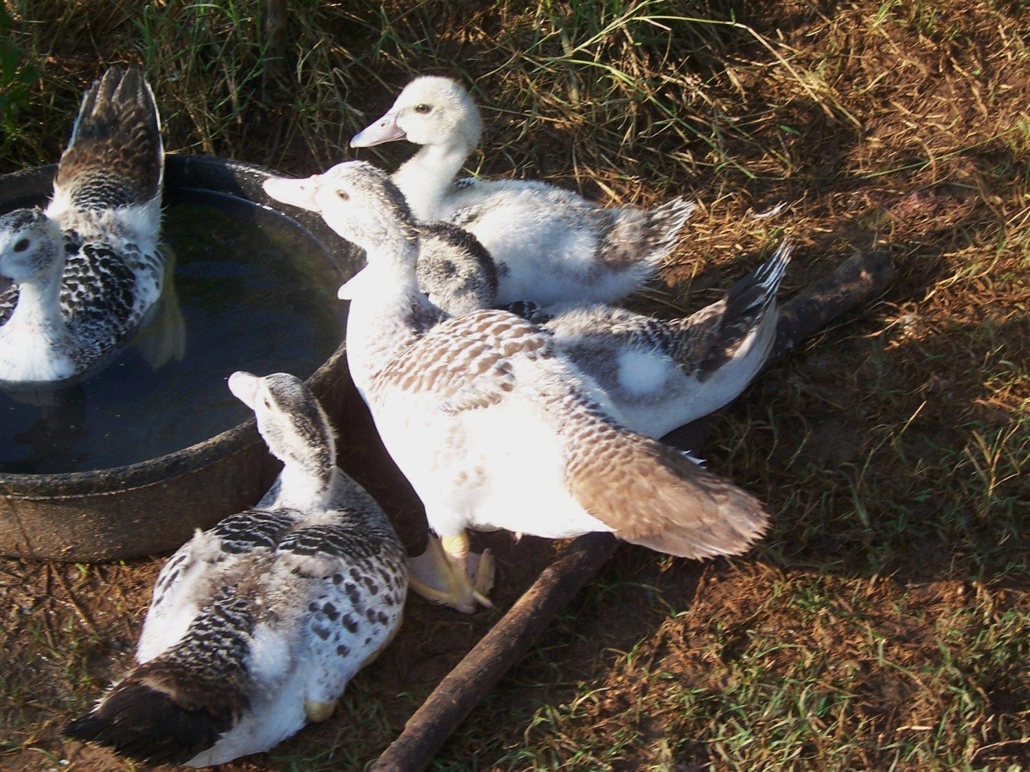 These are my babies. They're approximately 7 weeks old. They were given to me at about 4 weeks old. They didn't know much about them but said they were supposed to be chocolate Muscovy. Its hard to tell on the pictures, but the darker one is quite a bit larger. Hence they are bonnie and clyde. He is also starting to get the blueish shine to the tips of his wings
