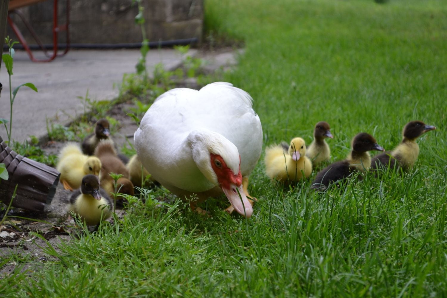 To answer your question: When she came out of the hole with her ducklings, the drake tried to jump on her. He was getting impatient. She didn`t want anything to do with that so she swam as fast as she could away from him. Ducklings behind her, trying to keep up. That first day, out of six ducklings, four were eaten by the fish. One week later another one was killed by the drake as he was, again, trying to jump his girl. As a result, I decided to buy two more females. So now he has three women. And next year four. Remember? A blue one!!