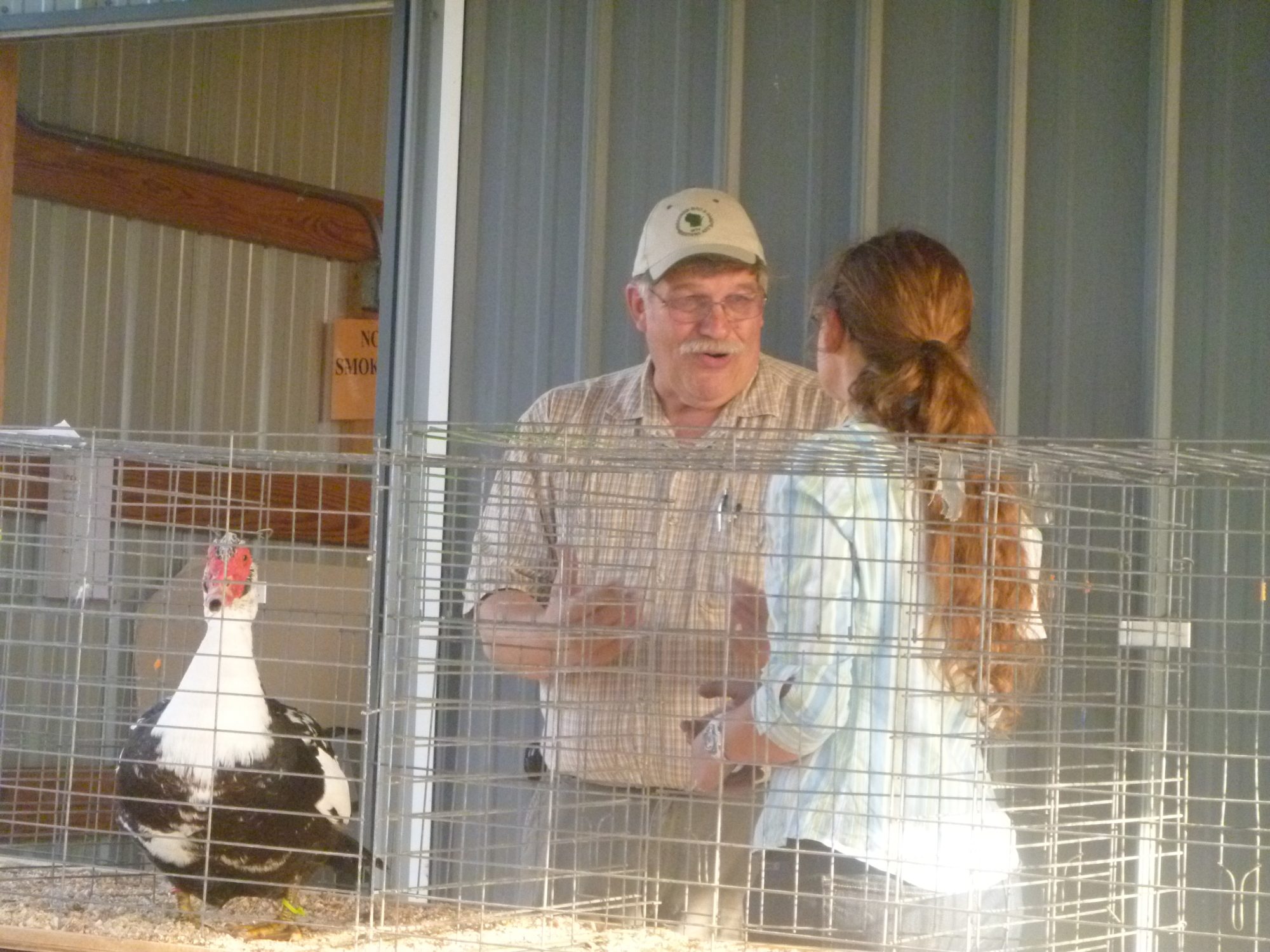 So i took Kenny and Kate, and Naughty to fair. Kenny merely was a muscovy young drake, and seeing as Naughty was very well behaved, I brought him up for showmanship. In the pressure, I forgot the info I wanted to tell the judge, Like "Their name comes from the word Musco Duck, meaning mosquito duck because they eat mosquitoes" and "they are a treedwelling bird" . But the judge was still amazed that i brought a duck of his size (a duck in general actually!!) for showmanship!! I got a white, because I couldn't turn him around to get him out head first. buuuut... thats fine. better luck next year!! ;) here's a quick pic of me, the judge, and Naughty. the funny thing was, for the breed class, the judge looked at me and said: "I cannot believe you are carrying this bird up to the table." He was massive. I put him at like 15 pounds!!