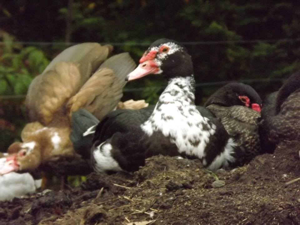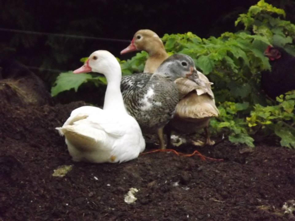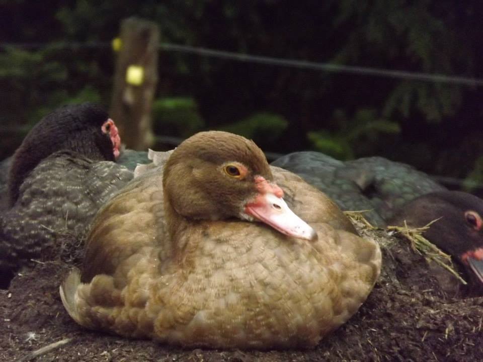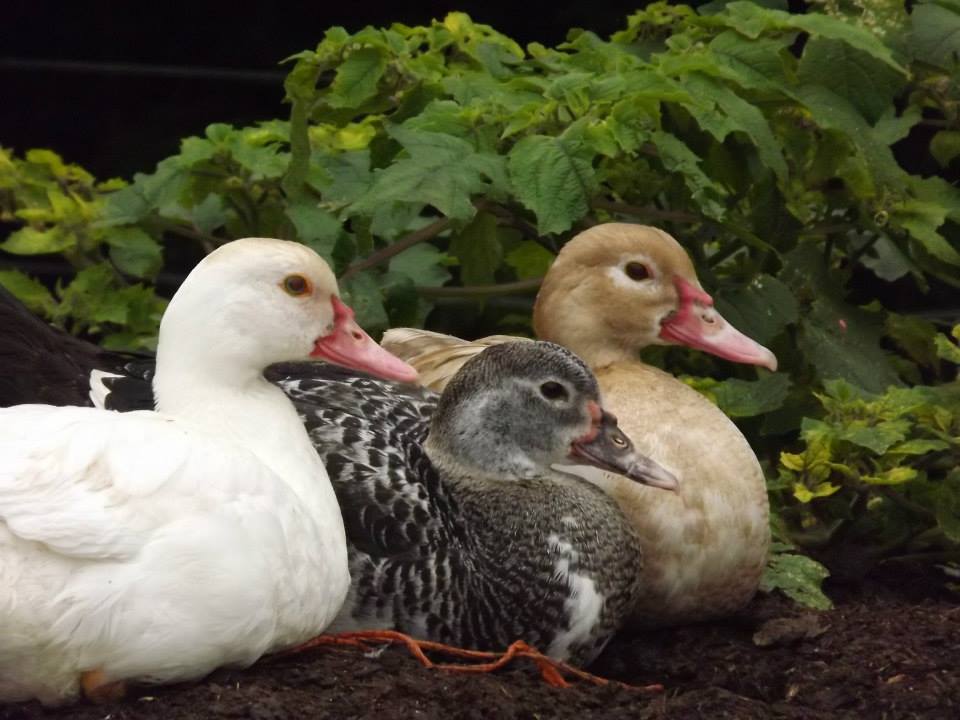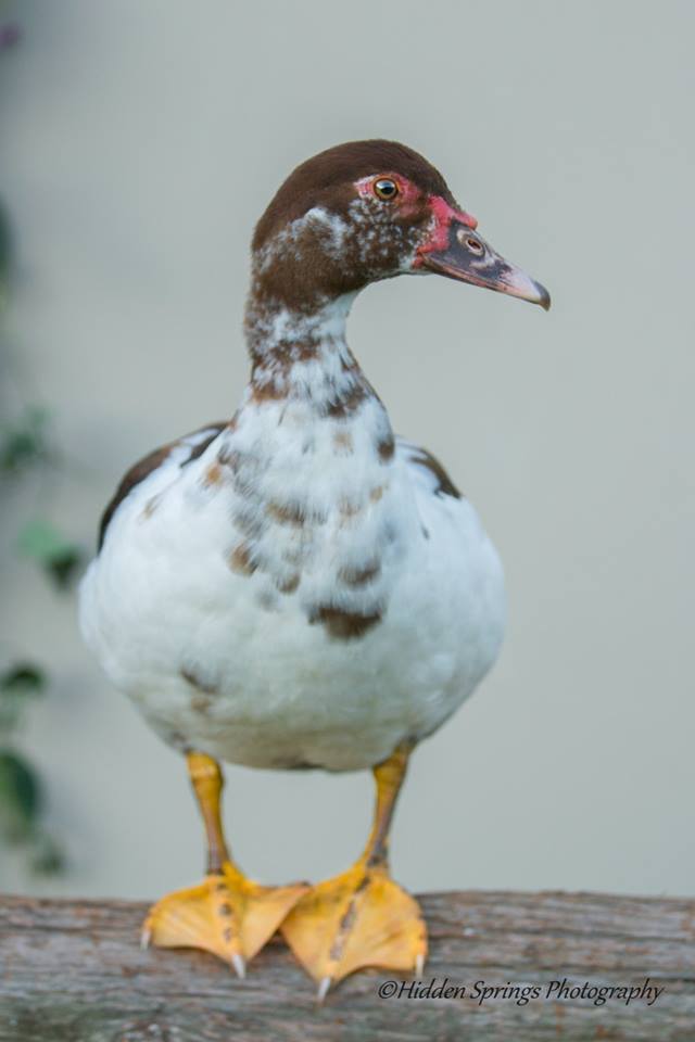 Actually, we named all of the ducks German names. Kuh is cow and flecken is spots. In Germany there is a chocolate bar that is marbled white and brown, and the name of the chocolate bar is Kuh Flecken, so that is her name. :D Pilz is mushroom, because she is mushroom colored, and Kecks is a cookie, we were thinking sort of a meringue cookie with a few chocolate chips, since she is mostly white with a few blue spots.