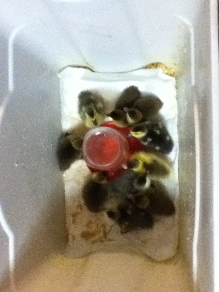 Just got my muscovy babies today from Country Hatchery.I was supposed to get 5 blues and 5 chocolates, but it looks like instead I got 6 chocolates and 4 blues. They are absolutely adorable. I will take individual pictures once they have settled into their actual brooder. This is only a temporary one since it's freezing outside and raining and I don't want to sit outside to take their water away from them every 15 minutes for then next hour lol.