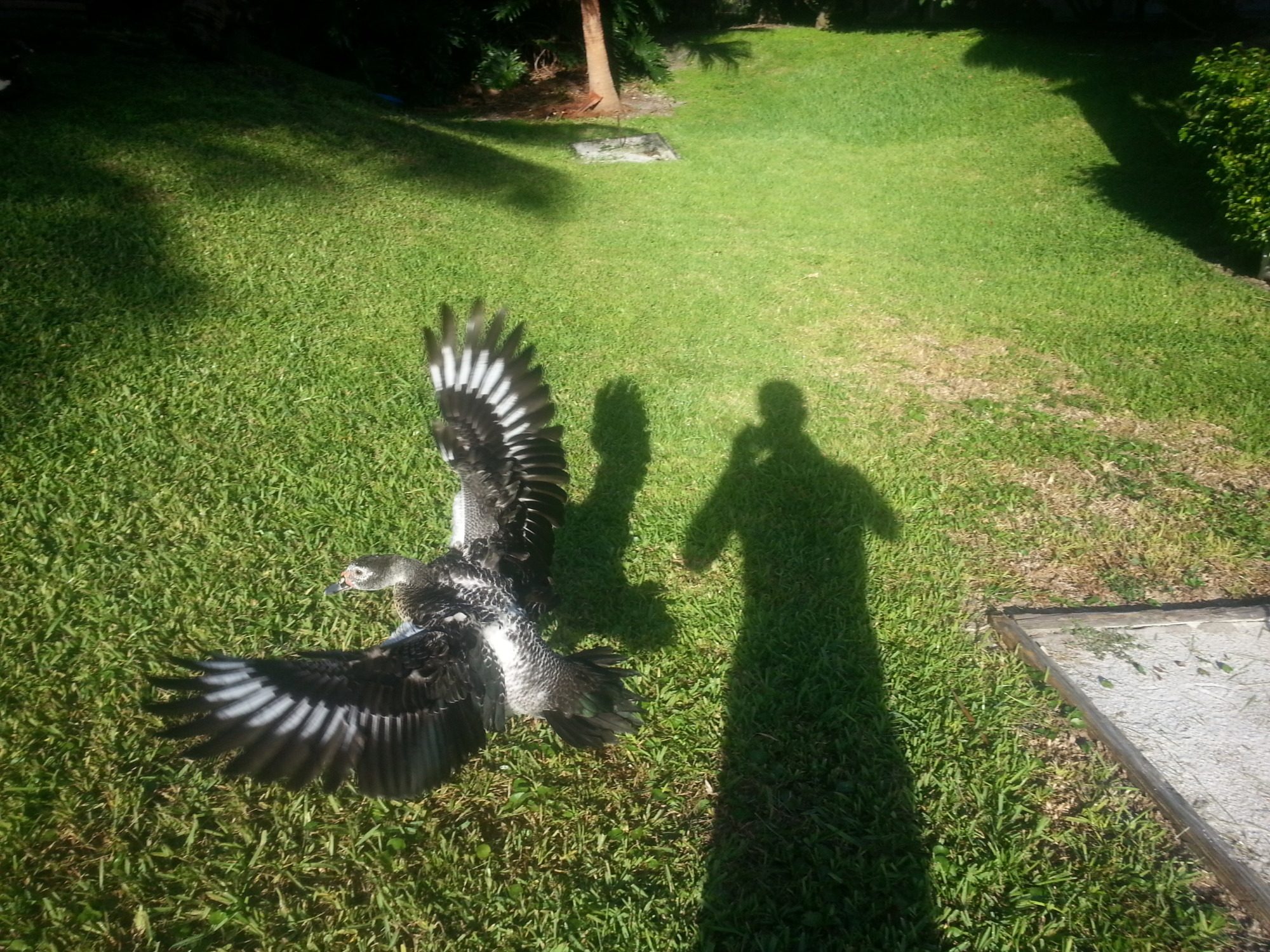 Here are my guys a few days ago, right around the 4-month mark. Got a great shot of the whitish one in flight. Also, I had always assumed they were males, but at 4 months they are making trilling noises, plus their flight feathers grew in long before their caruncling started to grow. And older ducks seem to want to mount the black one.
