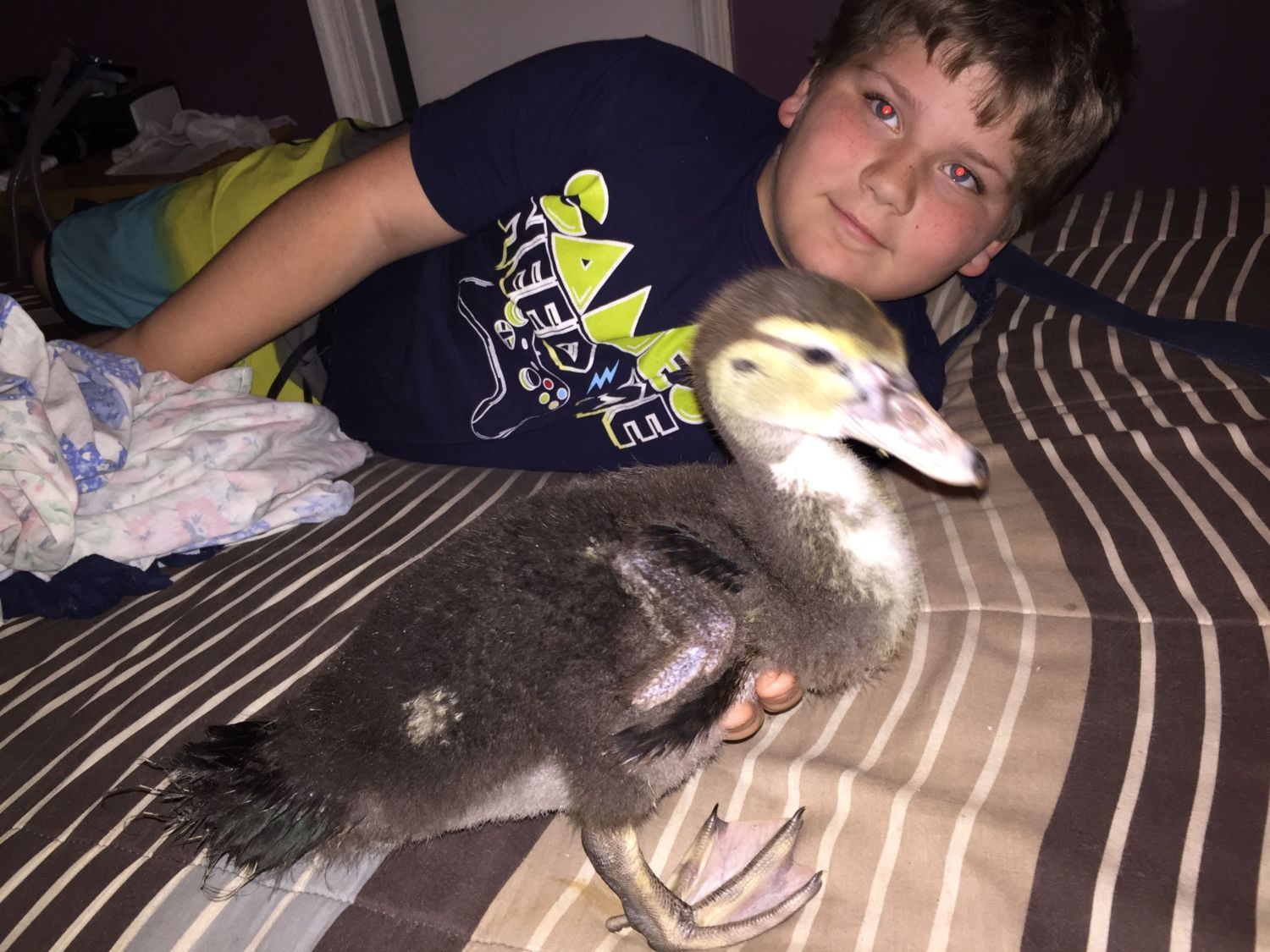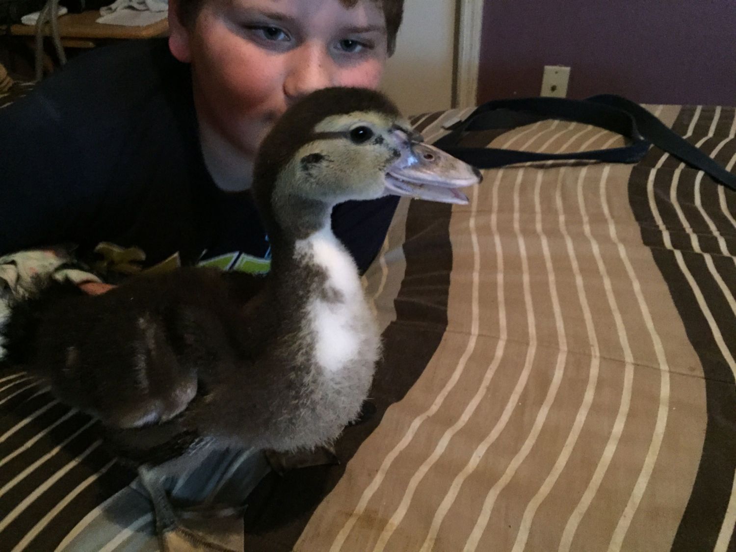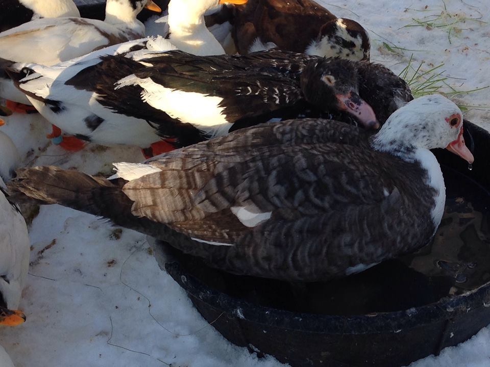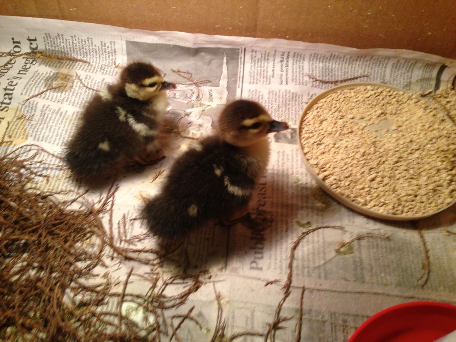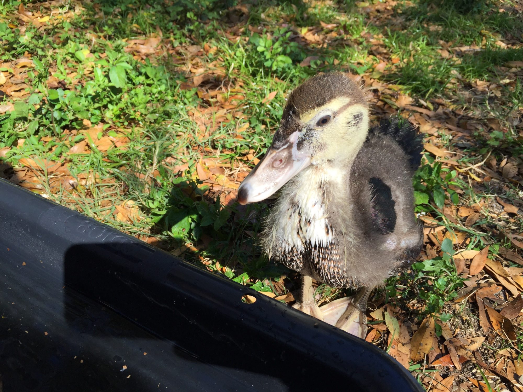 3 weeks ago my son came home with 2 hatchling Muscovys that wandered up to him at our neighborhood lake. No Momma in sight and dropping temps I told him to bring them home. The one was not well from the start and passed away a few days later. However the other is a beast of little duck and turned 3 weeks yesterday.
