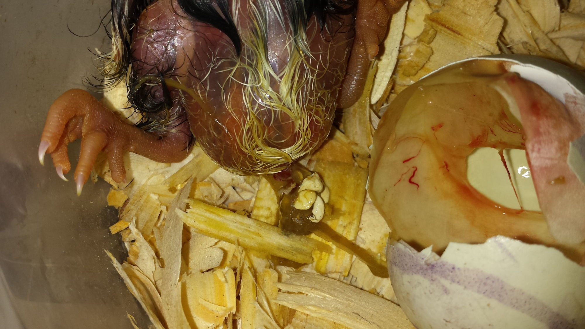 It hatched and began dragging its shell behind it. I placed it in a Rubbermaid container in the incubator immediately after it hatched--the floor is gross and I didn't want it getting exposed to whatever funk is currently lurking in my Stinkubator.