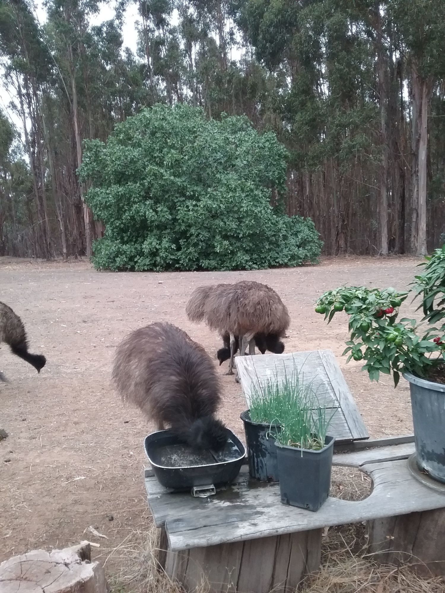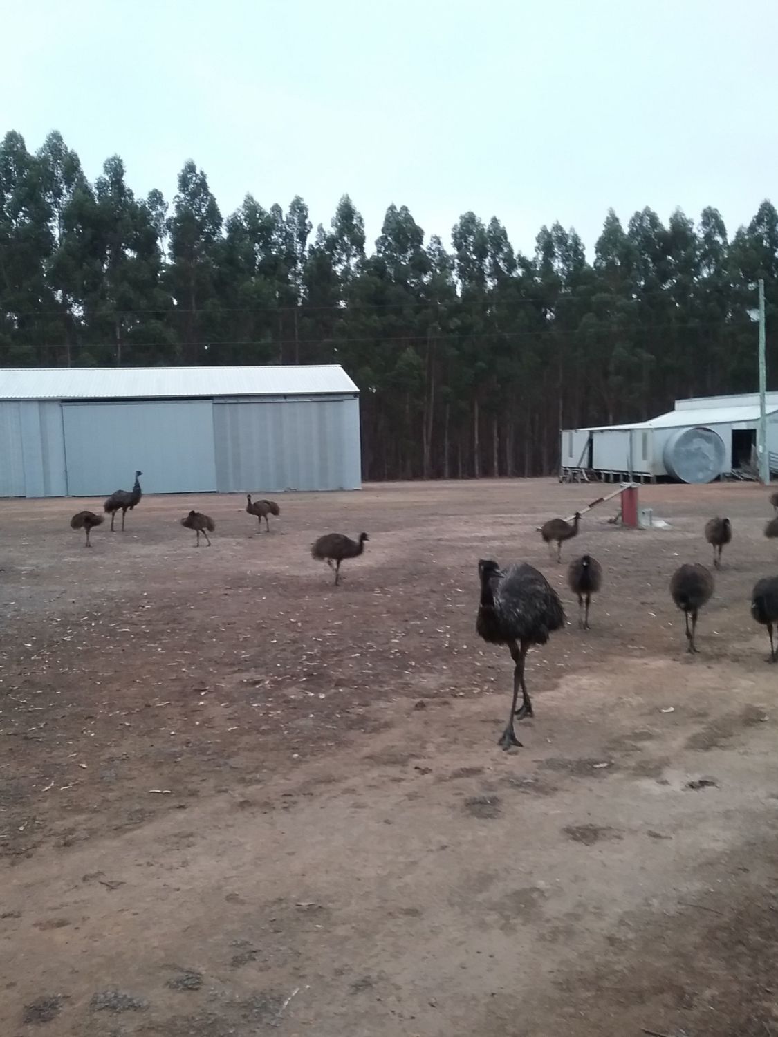Then a wild-wild male with five chicks turned up. So, the photo shows chicks from two different clutches. The wild dad is out of the shot. The two emus visible are both females -- females emus with chicks? extremely rare!!