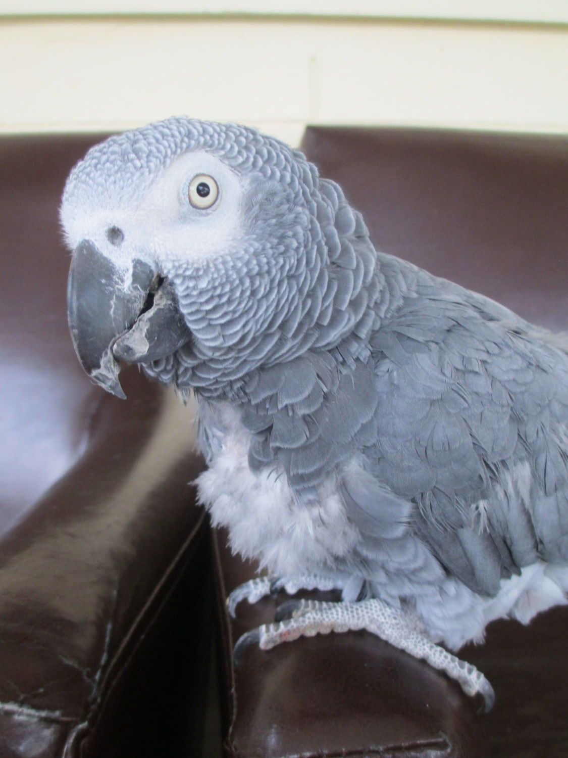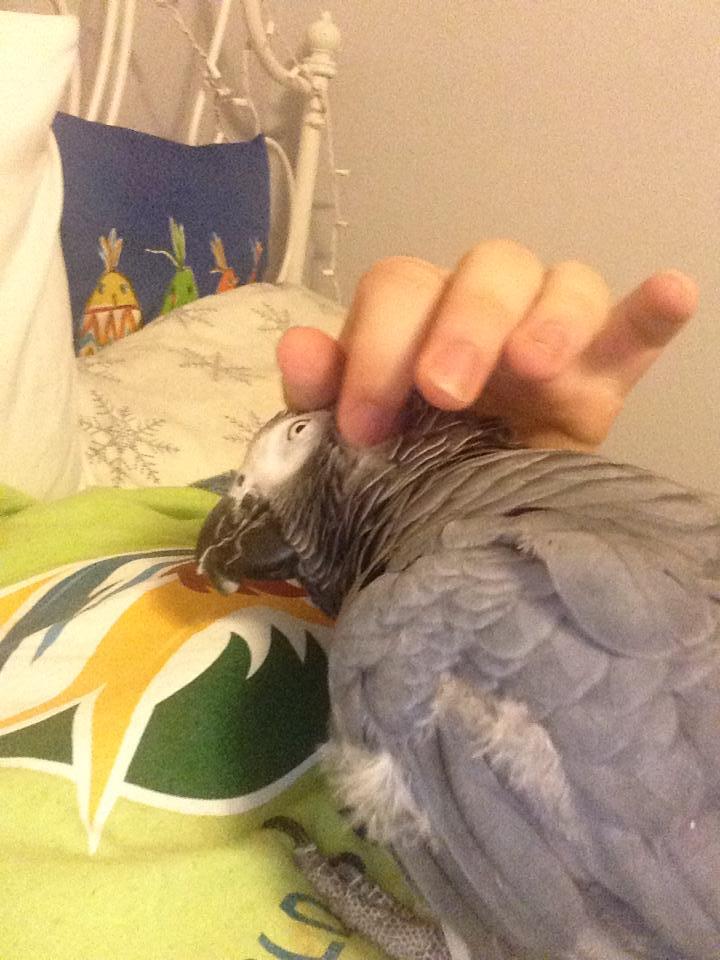 Grey Bird is a 21 year old Congo African Grey. He was my God-Bird, his owner wanted me to take him if anything ever happened to her or if she couldn't take care of him anymore. In February 2015, my mom got an email from his owner asking if I would take him now. Of course I said yes. He came home with me in March. Grey Bird had been locked in his cage for the past five years, after we think he bit the owner and she became afraid of him. The first day he was home with me, he asked me to pet his head, and I instantly fell in love. Within the first week or so he had come out of his cage and sat on top. We quickly became best friends, even though he wouldn't step up. He loved for me to sit by his cage and talk to him, and to pet his head. Later that year, in August, Grey Bird fell off his cage and asked me to help him by sticking his foot up. When he stepped up, giving me no troubles at all, I cried. An emotional rush came over me, that after being locked in a cage for so long, he had decided to trust me. It felt so good. After that, he started stepping up when ever I asked. It was amazing. What friendship we had, blossomed into something so much more. We are so bonded now, I love him so much, and he loves me so much. He is such a goofball. He has a full vocabulary, and uses it perfectly a lot of the time. He asks me for food by name, asks me to come get him or scratch him, asks me if I'm okay, and so on. It is so sweet. His favorite thing is to get head scratches. I swear, he would sit and let me pet him forever. I just adore him!