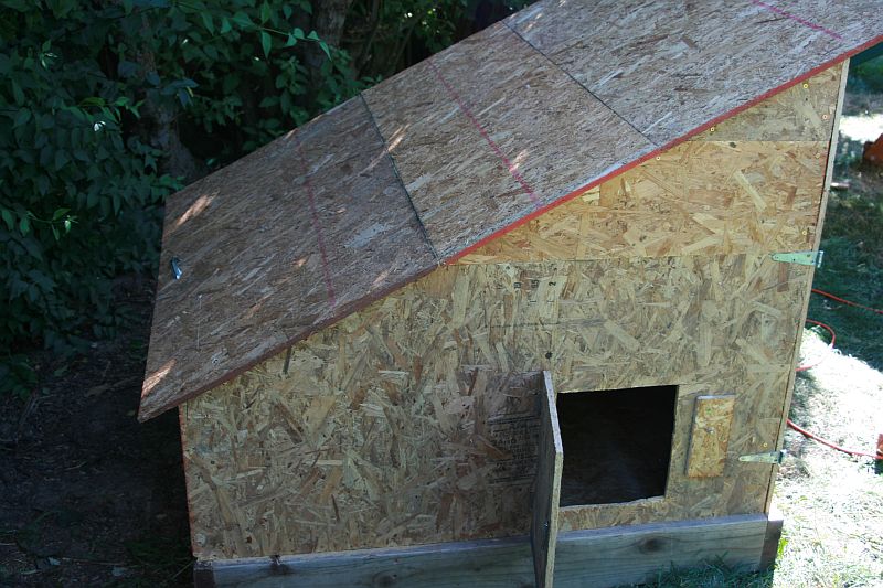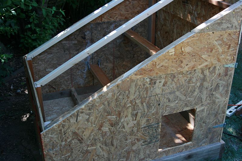 The sides are in now as well as the roof supports which are 2x2's. I cut a nice sized opening for the girls to go in and out of the coop.