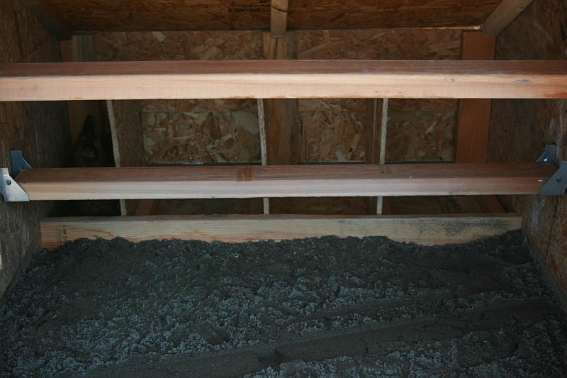 Here is an interior shot with nesting area in the background and the roosts in the foreground.