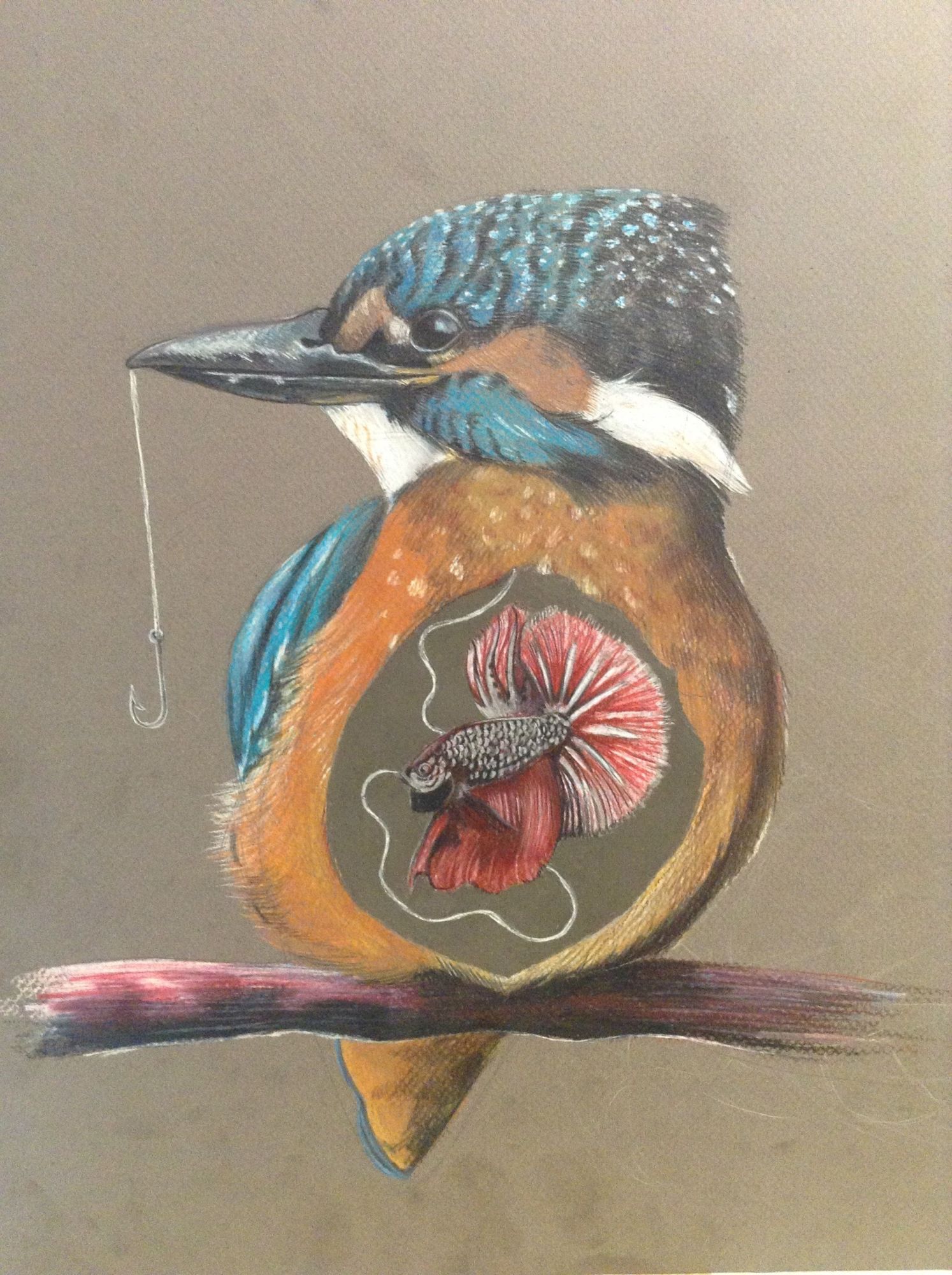 Hmm yeah. I tried another kingfisher. I had started on another which I was going to do the confinement being positive an example being pregnant/ the womb. I started a X-ray view of a chicken egg but stopped. It's sad to say but people at school give me a lot of grief sometimes for doing chickens and it gets to me... It's hard to defend myself inform of my class. I wish I had done a battery cage hen but my class wouldn't understand the gravity of the conditions and why I drew it. They would probably say something along the lines of, "why couldn't you have used something like a person in a box?" (Which half the class did mind you!) or "why not a "insert random animal/ object"?" Or they all would have sat there in silents. It is so frustrating that I have a passion out side of just art school and because no one understands it they think it is stupid. I know I'll probably get grief for this one because it is a bird too :/. Oh well I'm just ignoring my niece classmates for the most part now. I wish I had seen your suggestions earlier before I started. I guess now I put a "deeper meaning" on this one. Kind of the circle of life/ even the brave are striked down (using a beta which is as many know a aggressive fighting fish). Kinda an abstract piece but I'm gladiator was finally able to do something fairly realistic. Also thank you so much for your input. I rarely get very much creative criticism.