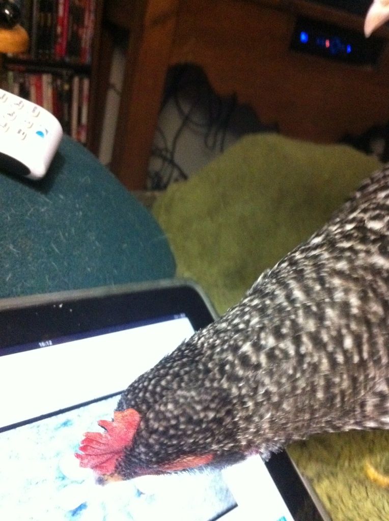 I thought I would return to add photos of my house chicken(s) watching the video on my iPad. Beth is the most interested; Punkin eventually decided to watch over her shoulder.This is an absolutely fantastic piece of video work, very inventive and a perfect video ambassador for chickens. I am SO impressed. I will be sharing this with all my friends! And I'd love to post it to my FB wall.... I hardly ever use Facebook, but this is worth getting off BYC for just a little bit (to post it, if that's okay).