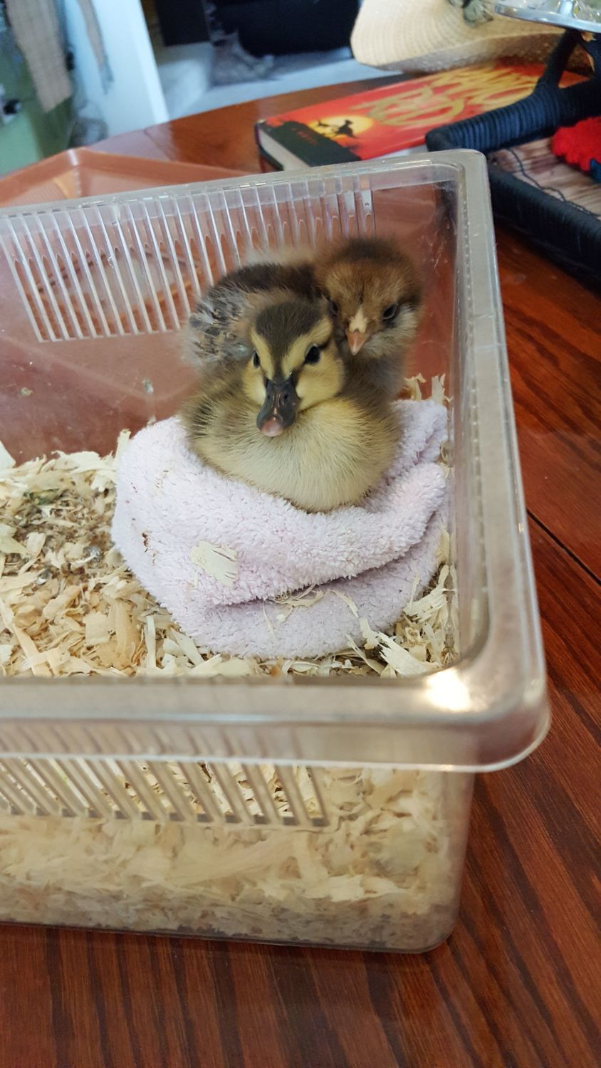 The long version is that I have 4 adult ducks. Then, I rescued a baby duckling from a storm drain (Stormy). After I brought her home, I knew she needed a same-age friend, but the hatcheries were out of ducklings for the season. So, I bought her a teensy chick (Sunny). I raised Stormy and Sunny together, and they have been inseperable all day every day for the last 3 months. My adult ducks harass them some, since Stormy and Sunny are significantly smaller than my big jerks.