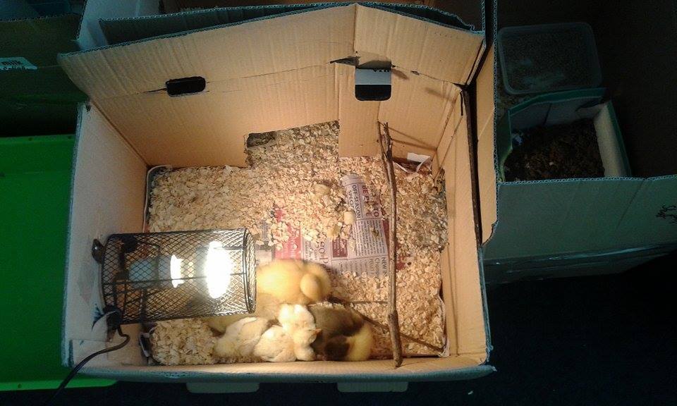I have 3 little muscovy ducklings (rescued from a friend's duck nest, it was destroyed by a dog), and 3 mixed-breed chicks. They're all about a week old now.