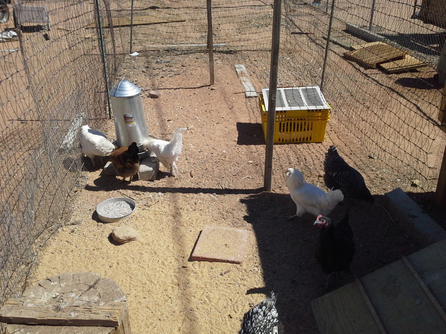 Mostly recycled and we're adding some deer netting to the top of the run this week. Also making a smaller coop and run for the roo replacement batch of chicks this week, they are in the yellow thing in the run....