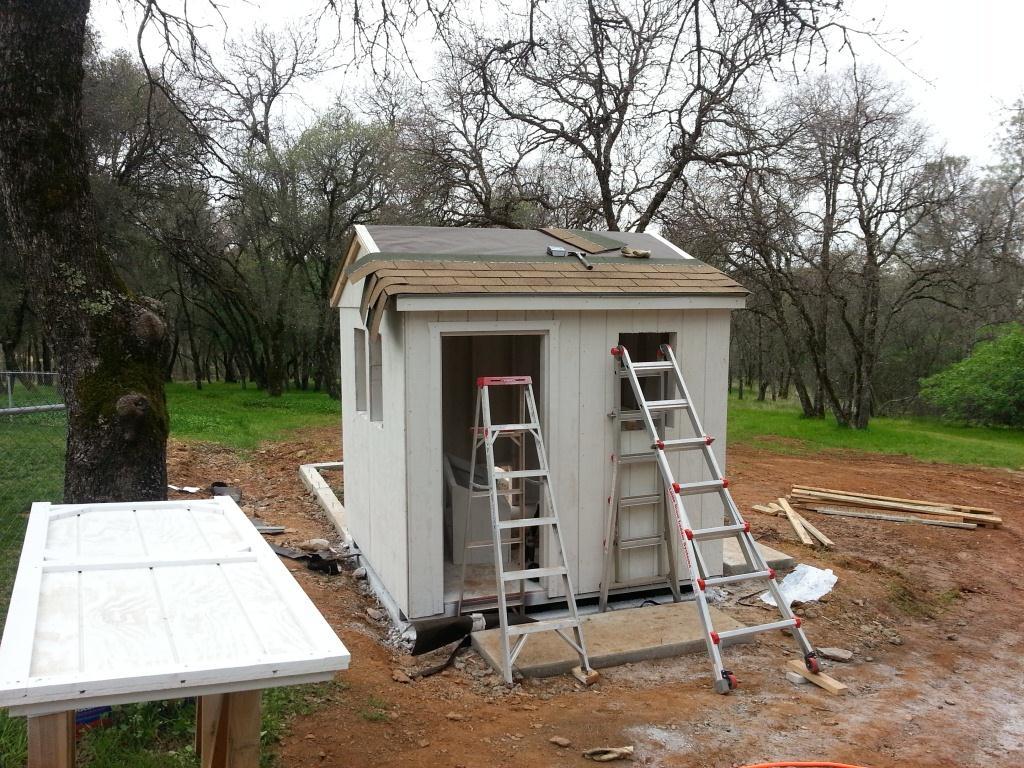 I got the roof on in the nick-of-time. The rain started to fall as I hammered the first row of shingles on. Luckily it was a very light rain, and didn't last very long. I only smashed my finger once with the hammer starting the 1" roofing nails. It almost doesn't hurt two weeks later.