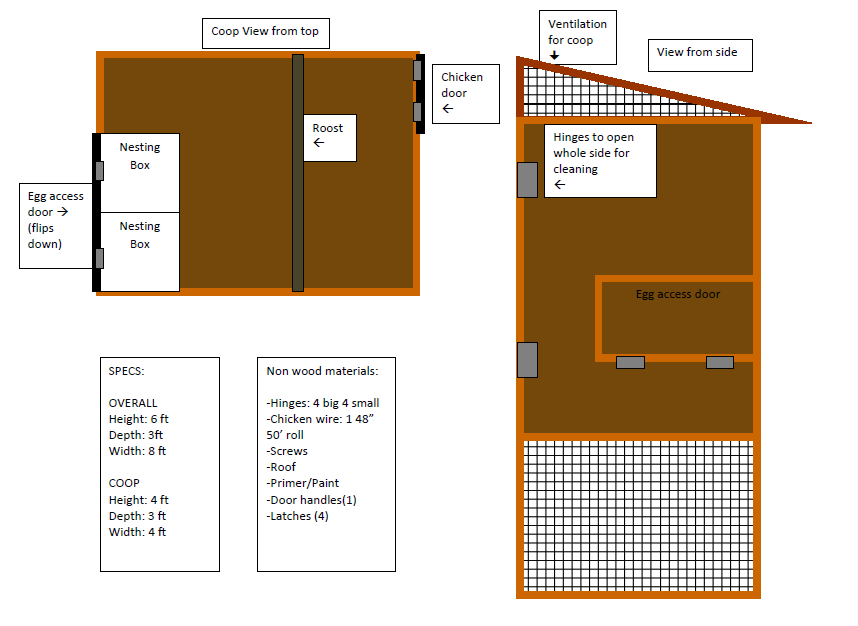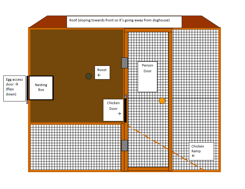 and to give a better idea of the scale, the nesting box is 1ft by 1ft, so roost is 2 ft off floor, and chicken door is 1 ft tall.