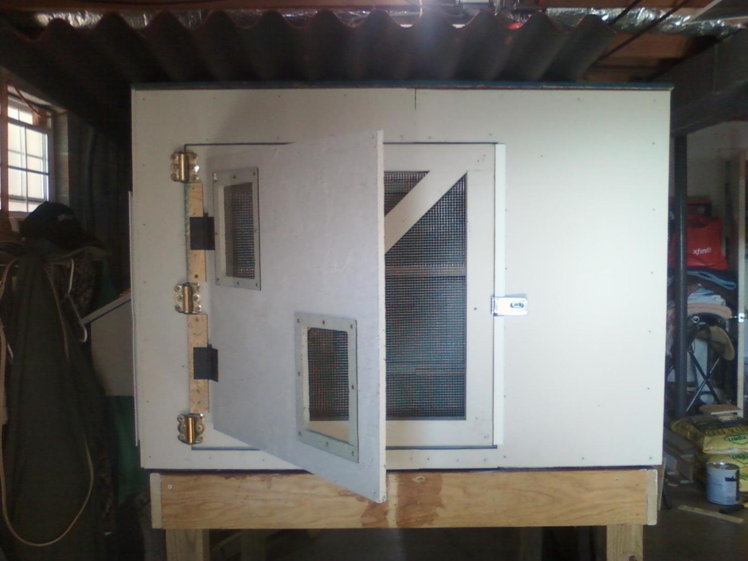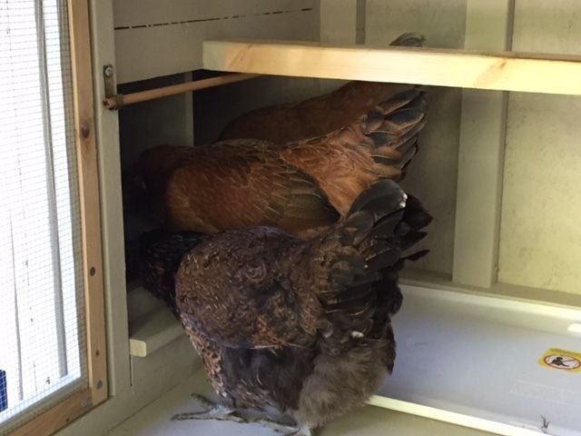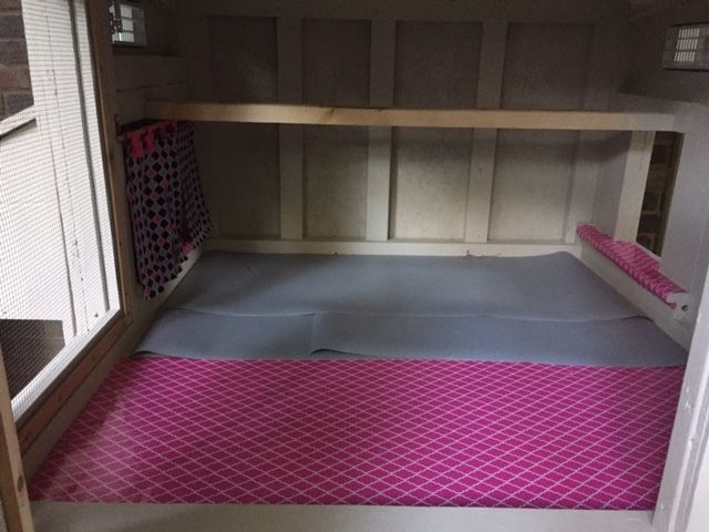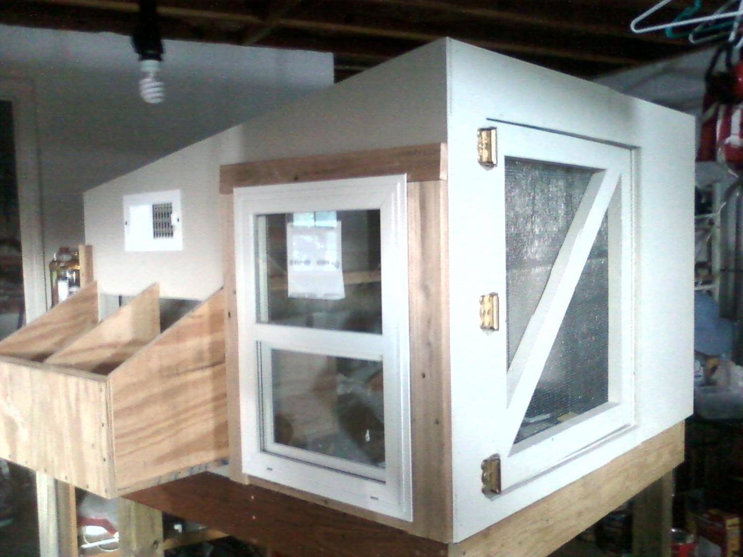 Of course one of my 'girls' turned out to be a boy. He's now living on a nice farm as a pet, and I replaced him and the killed chicken with pullets from the semi-local Mennonite farm. Now with 4 almost-grown girls ready to lay eggs at any time, and because their former house wouldn't work in the new coop, my dad got to work building me the ultimate chicken house. There's new construction near him, so he recycled scraps to keep costs down but also to make sure it was "new house quality" materials. It is built just like a mini house with studs, Tyvek house wrap, insulation, agricultural roof shingles, the works. He built it completely with screws and took it apart many times to get everything just right, with hours of study online, including BYC. The rafters were ground down and rounded so they don't hit their head, the roost bar is rounded for their comfort, the nest box and doorways are ideal size (per the internet,) and everything is triple painted for outside protection. They have a real pivot-to-clean window that's nicer than the ones in my house, a screen door that has a winter door covering for cold weather, adjustable vents and cross ventilation, and 16 sq ft of living space for 4 chickens. It's raised on a sturdy base with hooks for their food and supplements to hang below, and they can play under it, inside it, or on top of it to maximize coop space for them. I love it and they love it. I've decorated the interior (and they de-decorated) and will eventually get them a custom sign once I decide what I want it to say.