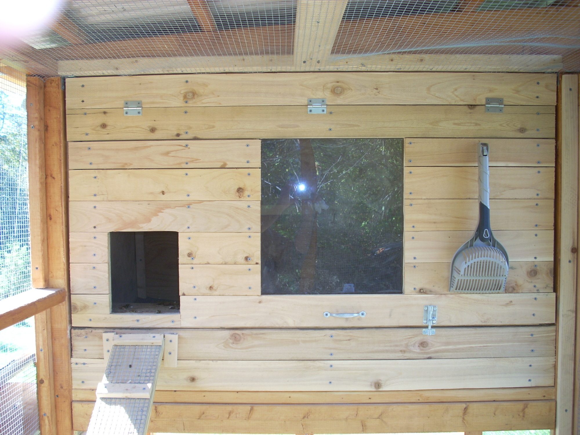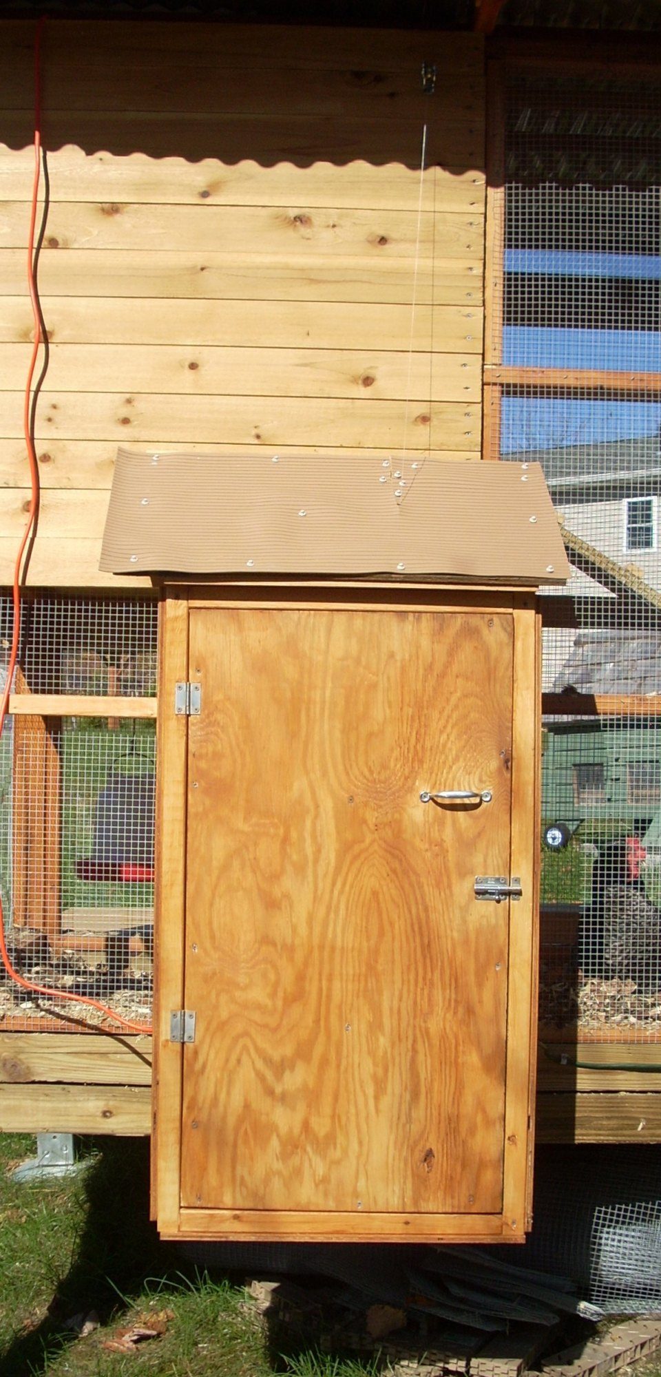In the back of the coop is this enclosure. Notice the fishing line at the top of the coop (with a pulley) running down into the enclosure.