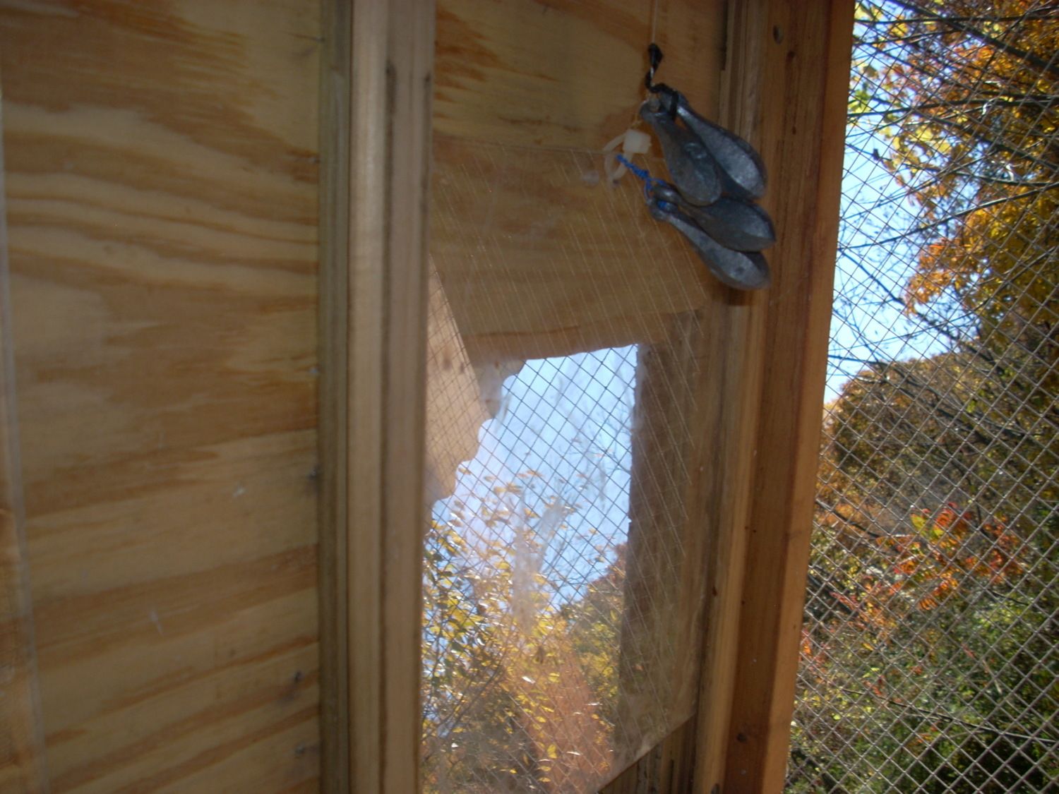 This is a difficult picture to see (difficult to take as well) but this is the POP door. It’s basically Plexi-glass on two tracks and some fishing weights attached to the top of the glass to add weight. If you look closely there is a twist-tie placed on the top center of the glass where the weights are attached. Also, but impossible to see is heavy-duty fishing line. That fishing line is used to open and close the door.