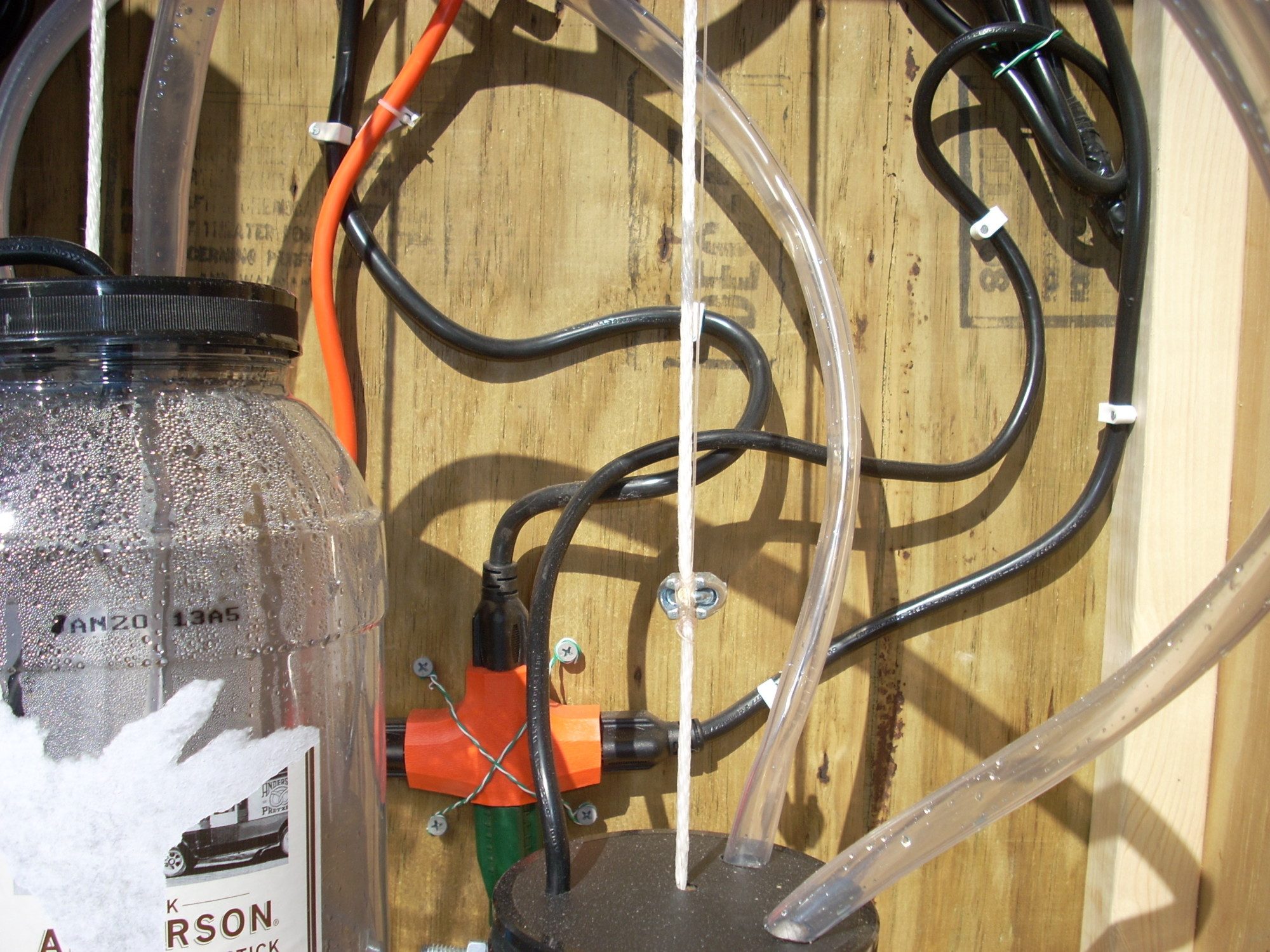 Each of the three electric timers are plugged into the splitter. And the water pumps themselves are plugged into the electric timers. Also notice the cloth-line on the right-hand side has a small clamp attached to it. This is where I attached the heavy-duty fishing line that is used to open and close the pop door.