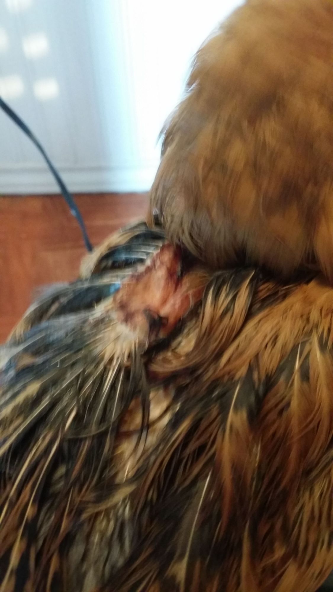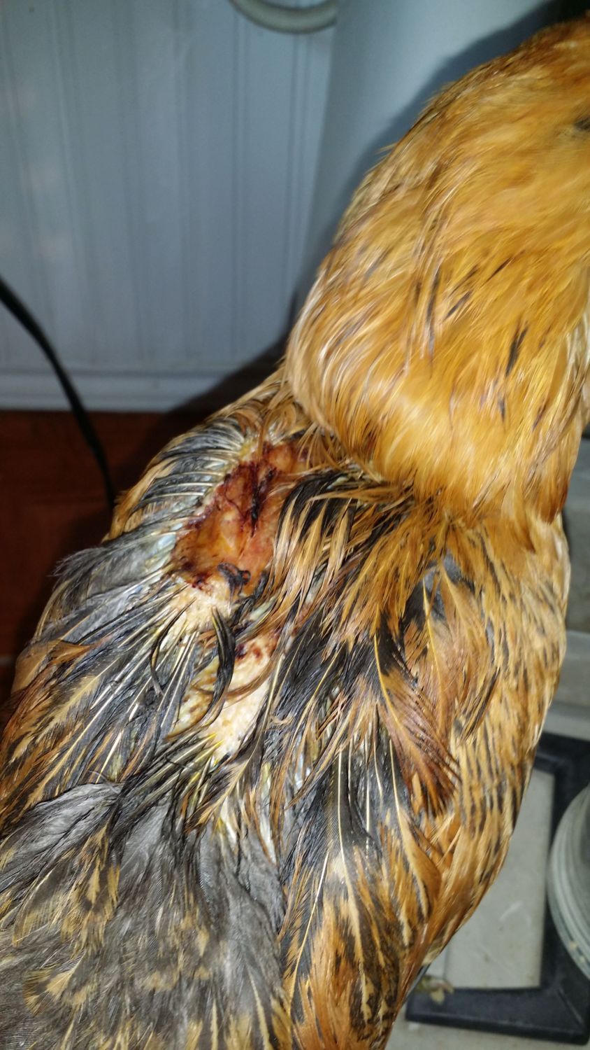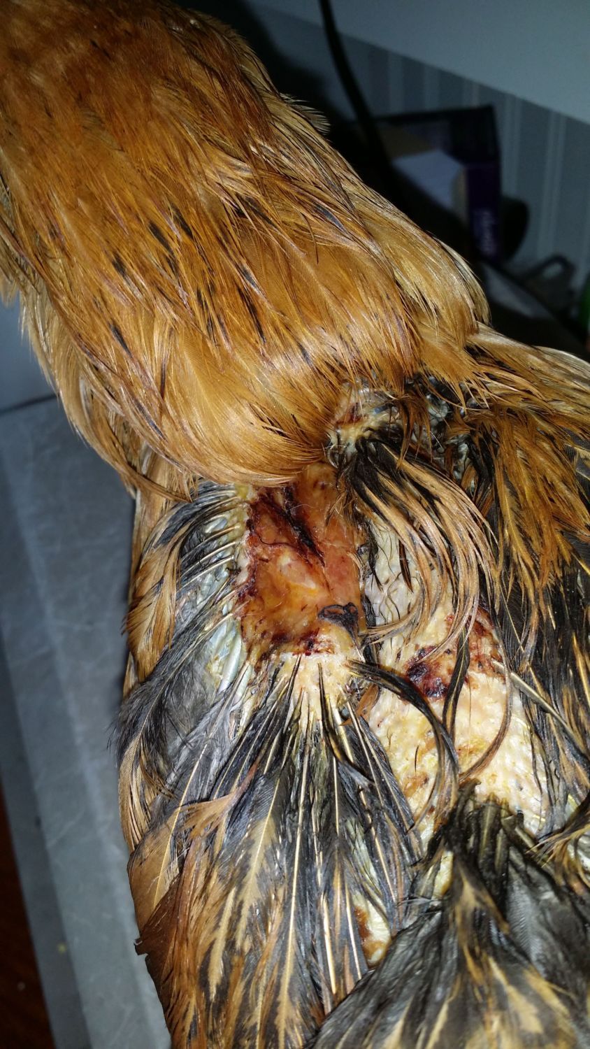 My dog ripped the skin and feathers totally off of her wing and ripped all the feathers off and leaving puncture wounds on her back. Her back is healing and looks good. But her wing well looks like meat. I guess I just want to know what is going to happen to her wing. I'm under the impression that she wont regrow feathers on that part of her wing as there is no skin. How do I know when I can put her back outside. Right now she is inside due to flies. Here are a couple of pictures of here. They were taking a day or two after the attack.