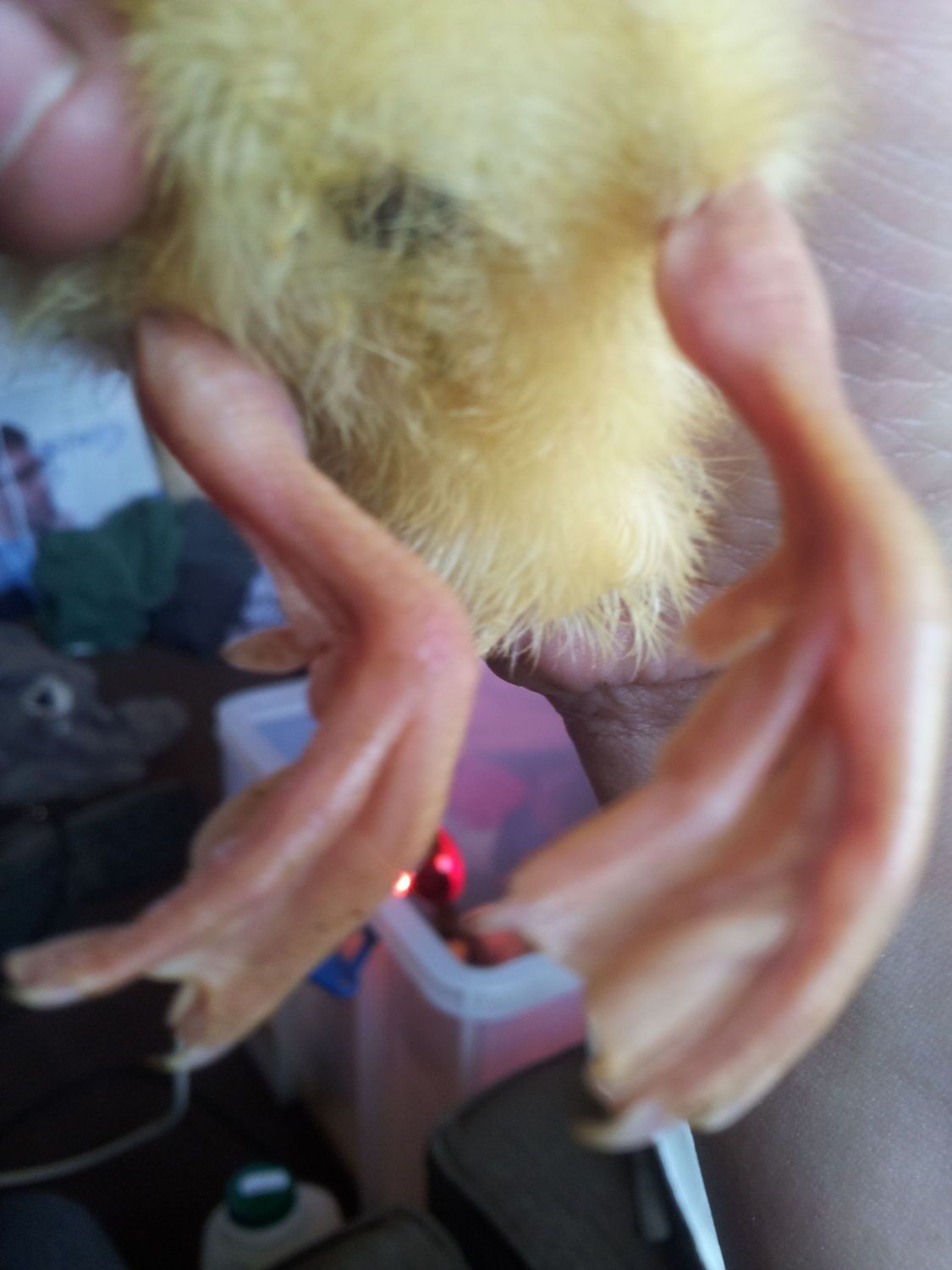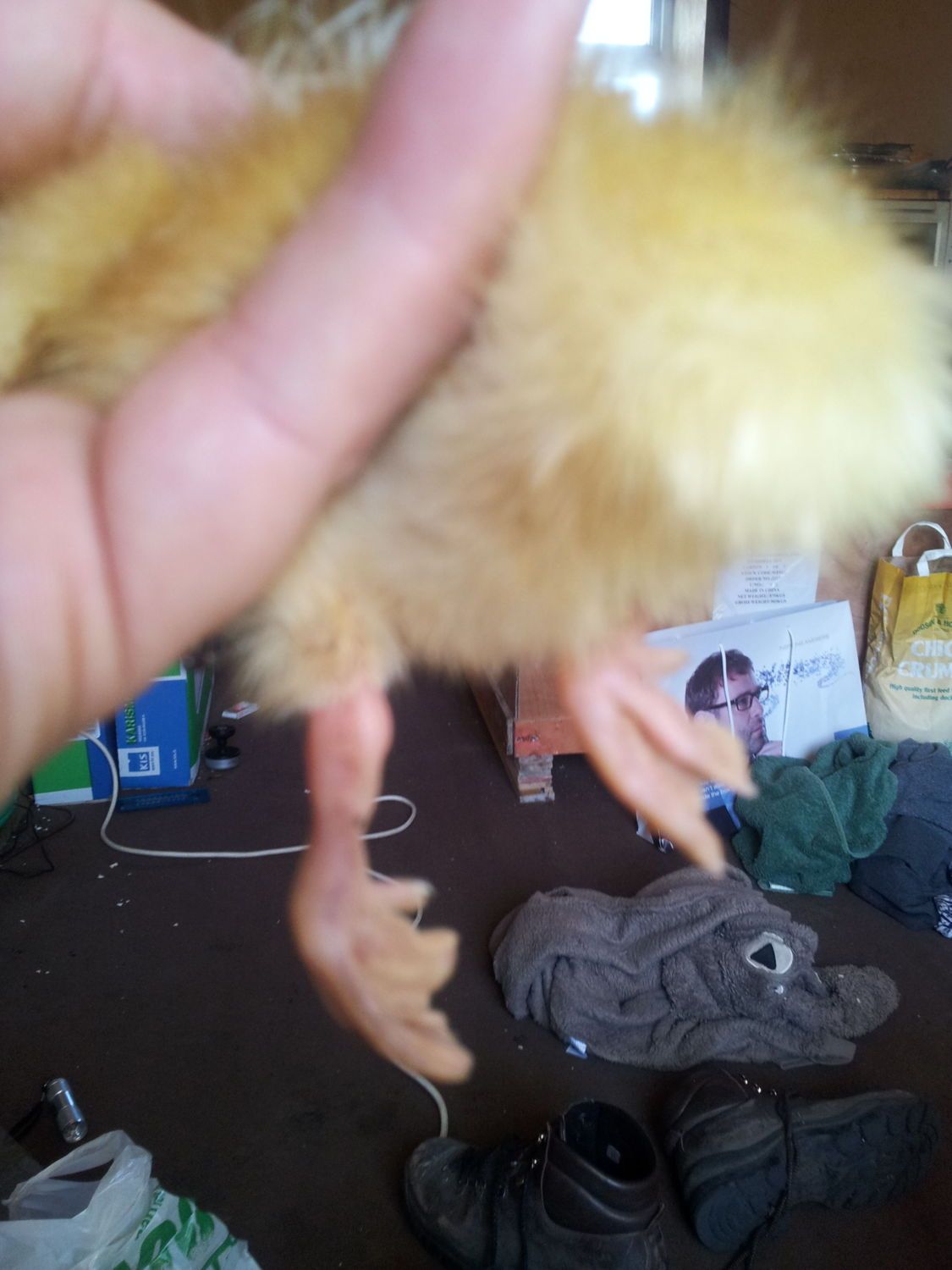 His right leg twists inwards :( But, we'll see what the vet says in the morning! Hopefully she'll be able to sort him out :) I'm not confident enough to attempt it! He's a lovely little thing! Currently hand feeding him chick crumb with brewers yeast added. He does find it hard to get comfortable though :( I've made him a little nest with my fluffy dressing gown which he likes!