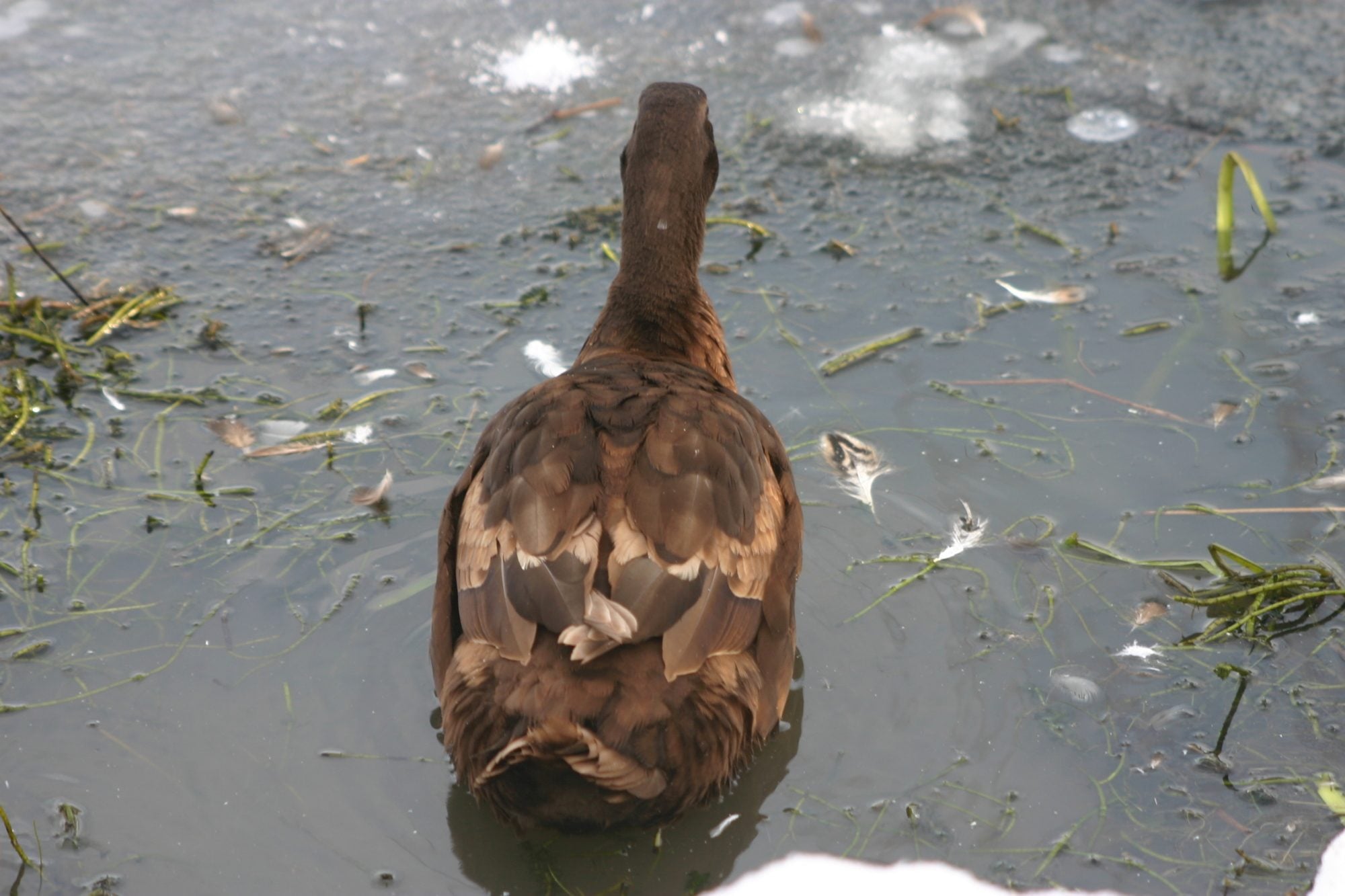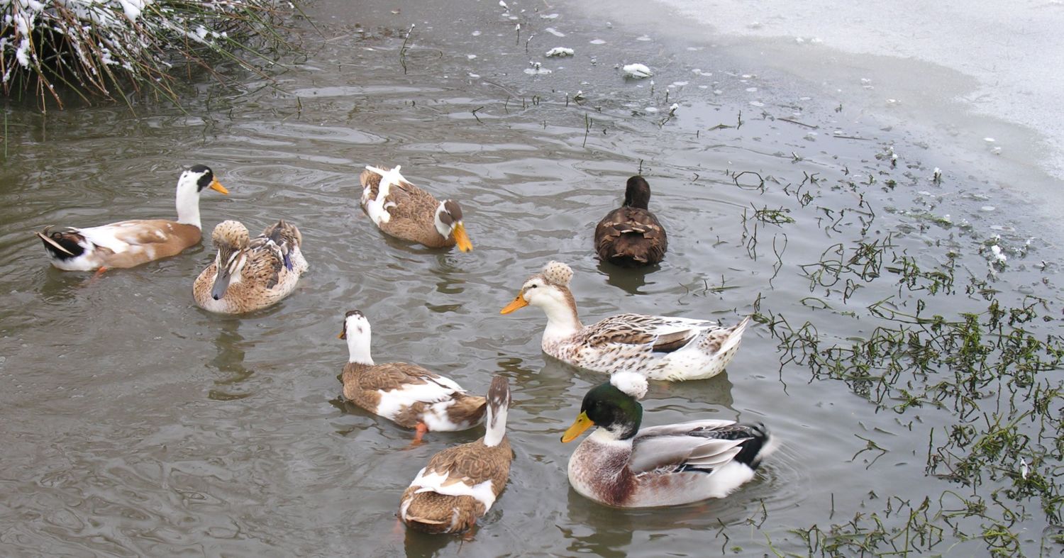The ducks are in a reduced area of the pond