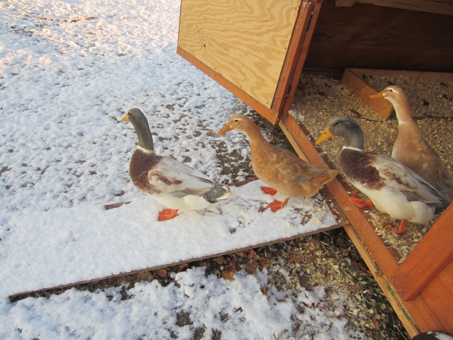 That's what is nice about this time of year. Ducks can come outside walk around in the snow eat play and go back inside for warmth and we get to watch it all.