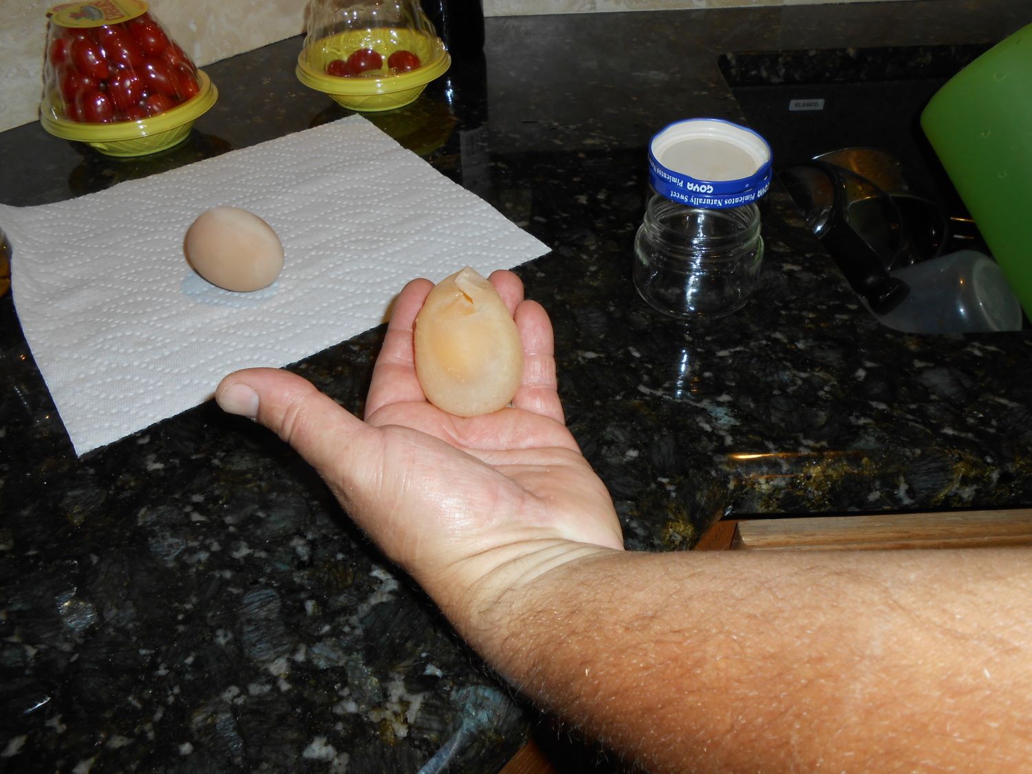 The egg on the counter is the one we helped get out and my husband is holding the "water balloon" egg.