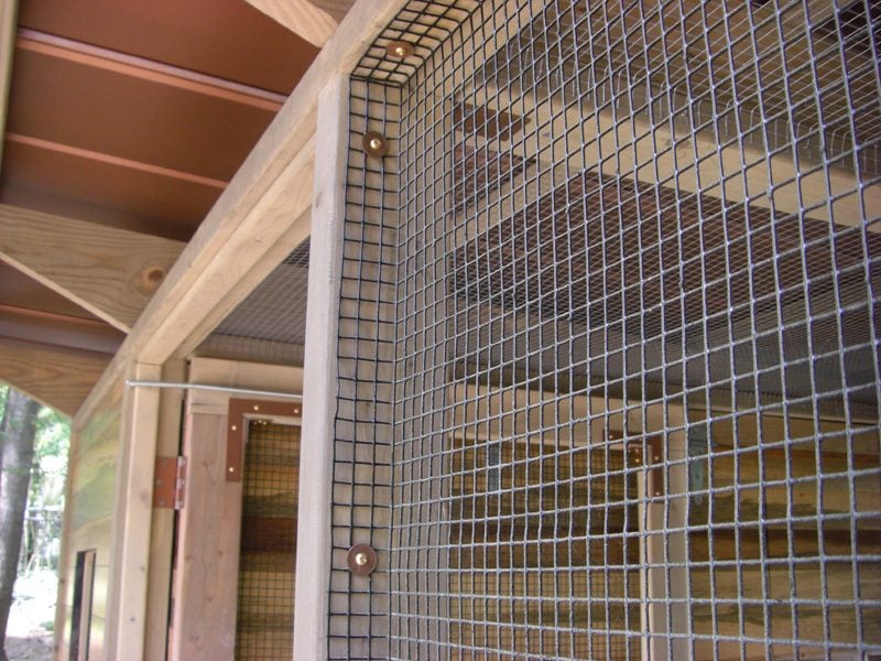 Here you can also see the 1/2" x 1/2" black coated hardware cloth which I used to secure the run. I used old copper pennies and brass screws to attach the wire, giving it a 'buttoned' look. The best deal I could find for this type of hardware cloth was from Academy Fence.