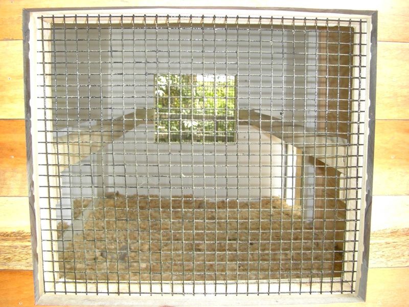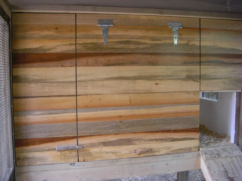 This (heavy) door opens and attaches to the roof of the coop to allow access to the inside for cleaning. The weight of the door and the swivel branch keeps the door shut tightly when closed.