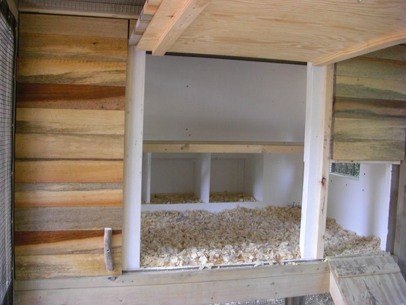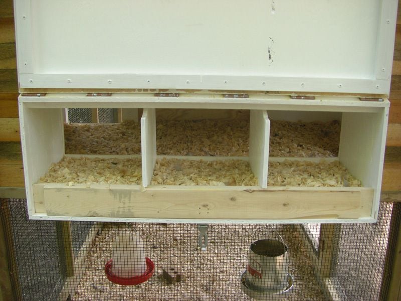 Three nesting boxes, none have been used yet as my birds are only 3.5 months old. The trim around the door helps to keep light and wind out of the coop.