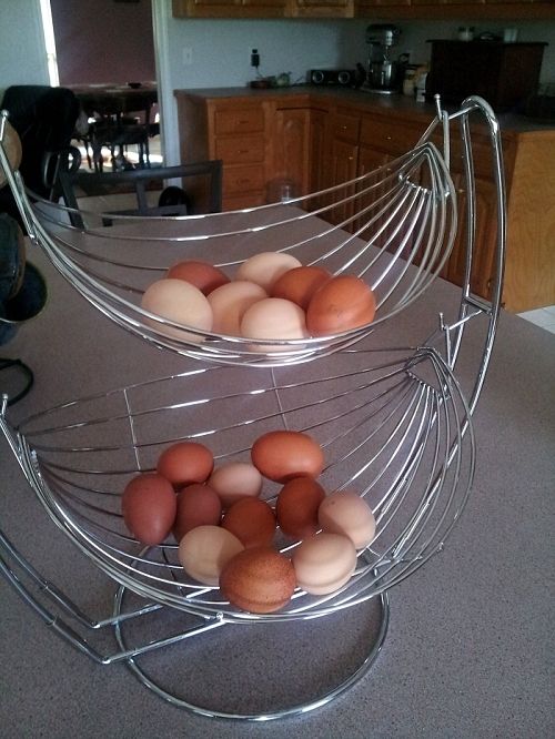 I have 5 pullets that started laying about a month ago. One holdout finally started laying a couple days ago and today was my first 5-egg day. Best part was that they all laid in the nest boxes too! Here's my egg container. The ones on top are first pick-the bottom ones were laid within the last 3 days. This way when I go to grab eggs I can just pick from the top and not have to read the dates penciled on them.