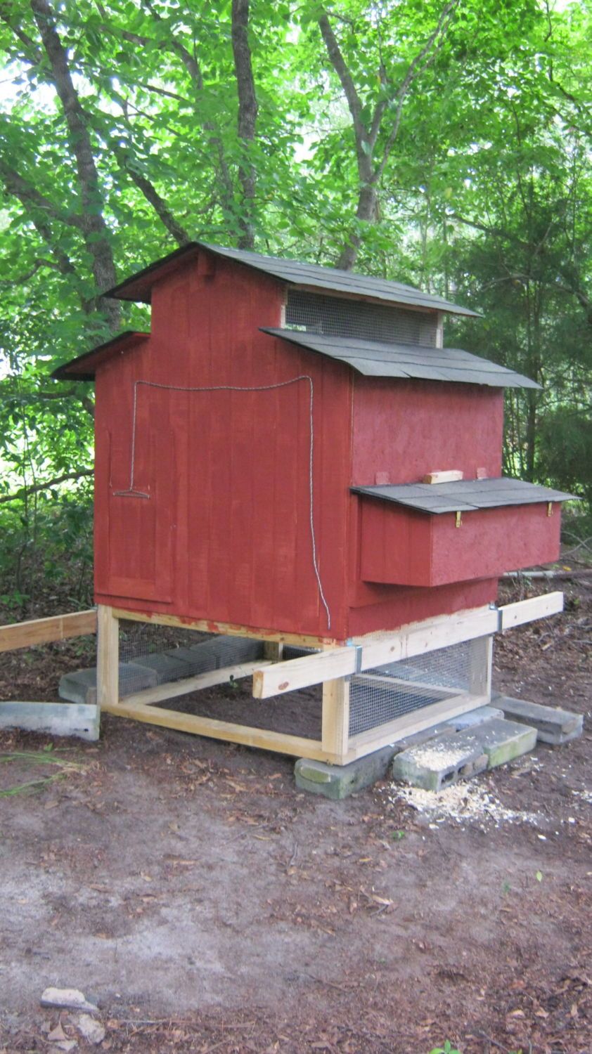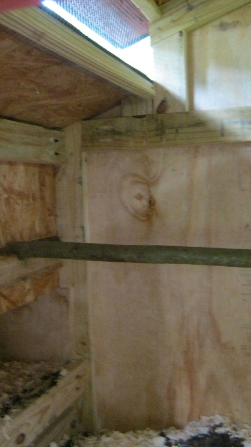 Perch and ventilation. I tossed a few handfuls of leaf litter in to seed the bedding with good bacteria for the deep-litter. There will be NO rain getting in through those roof vents and no chance of our vicious, southern, summer heat building up.