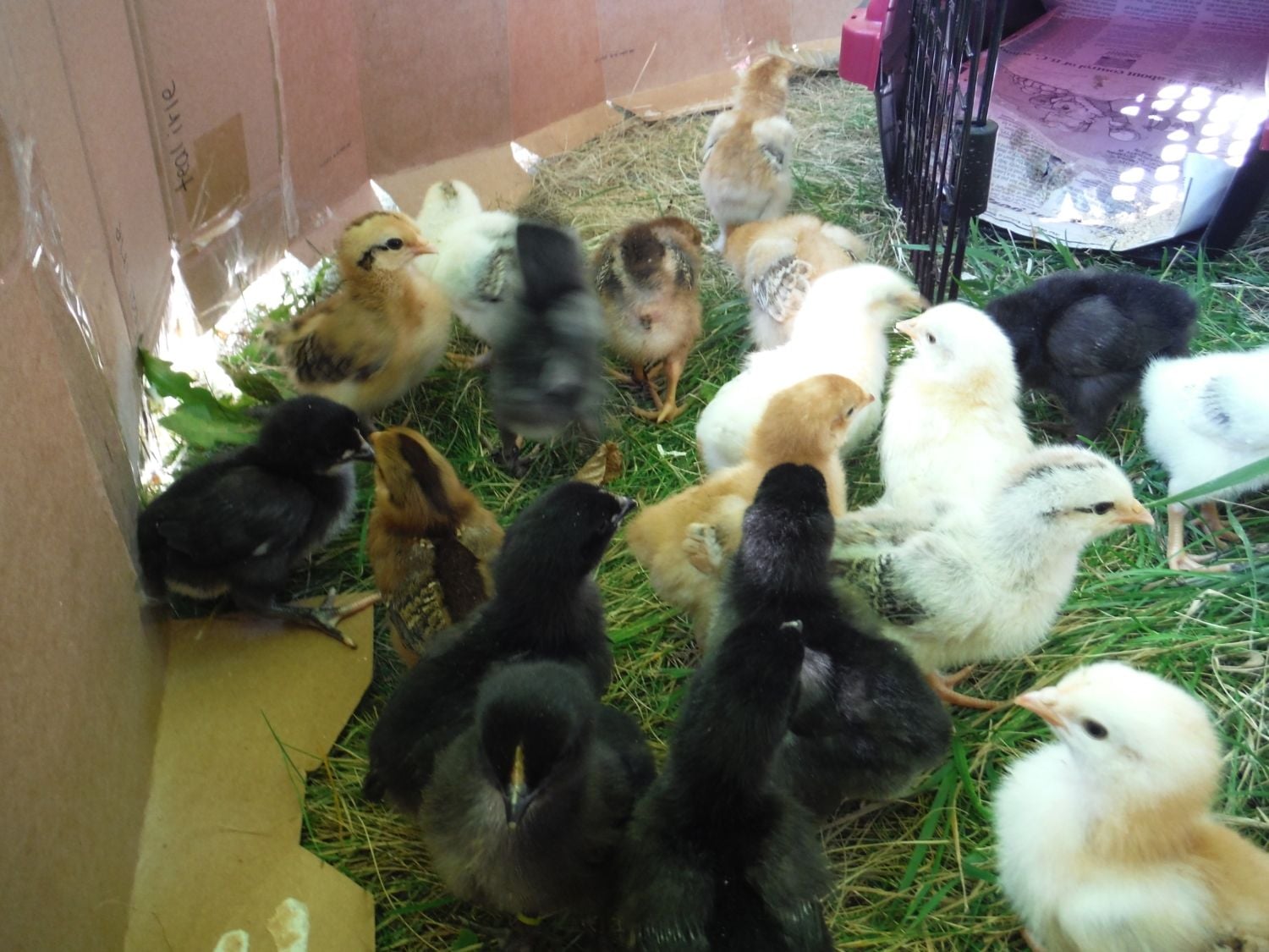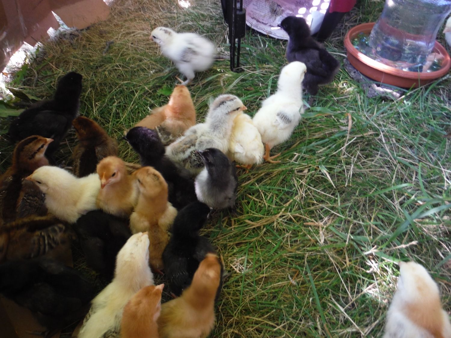 We've had these little guys since the 2nd and they hatched on the 31st. They are from a mixed breed certified organic flock from a nearby farm. We didn't ask what breeds are in the flock to make it even more of a surprise as they develop. these pics are from their first trip outside on Sunday and a few of the brooder. They are already very friendly and crazy acrobatic, silly things can jump nearly 2 feet up.