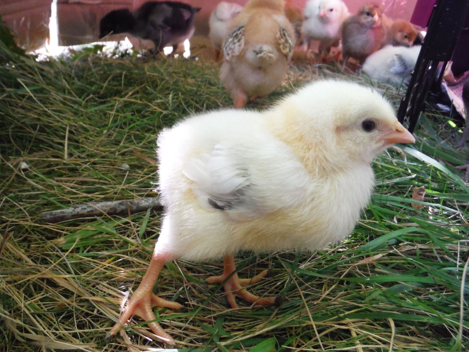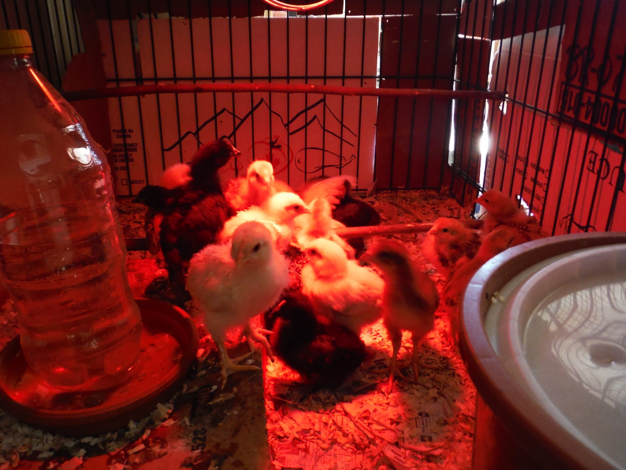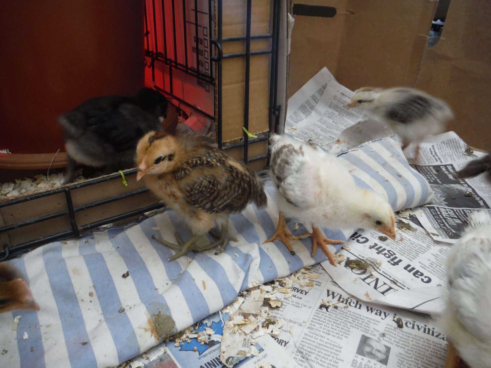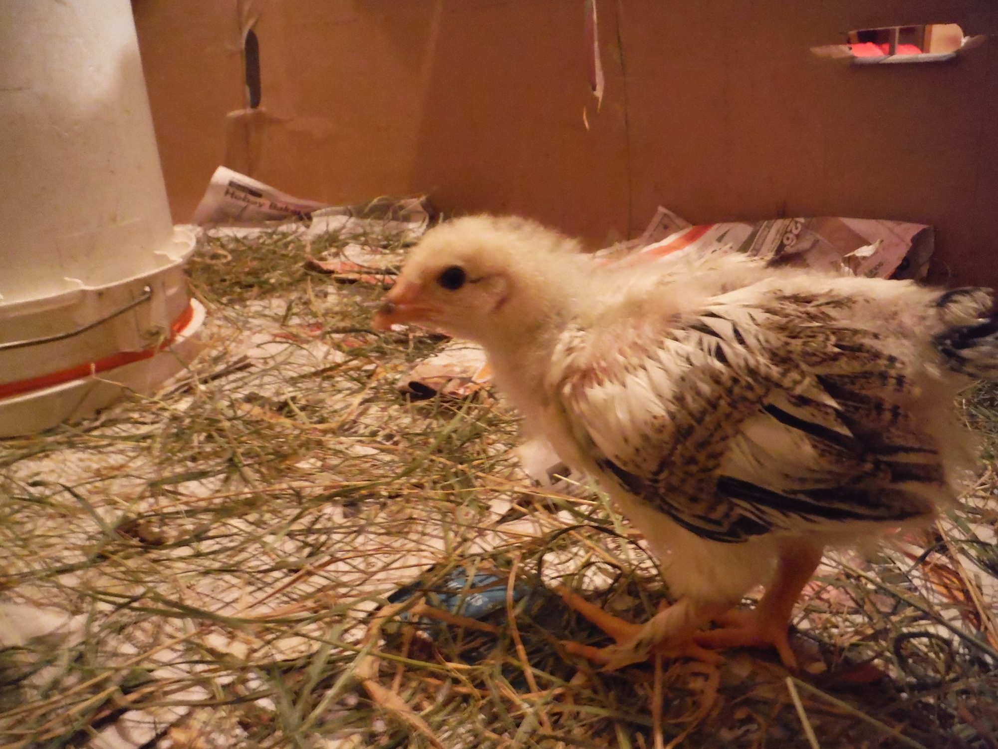 I've recently been told that Brahma, Buff Brahma, Dark Brahma, black Australorp, Danish Brown Leghorn, Sussex Red crosses, and Rock crosses are some of the breeds in the flock these chicks came from. So excited still to see what they all turn out to be. So far only a few chicks really stand out from the others and I'm crossing my fingers they are pullets. especially the one with olive legs and the tiger coloured one with fuzzy legs......actually i hope all 4 with the fuzzy legs are pullets, or at least really sociable cockerels that get along with my current head roo Chester(as in Chester Fried Chicken. Not sure if that's just a Canadian chain or not hah)