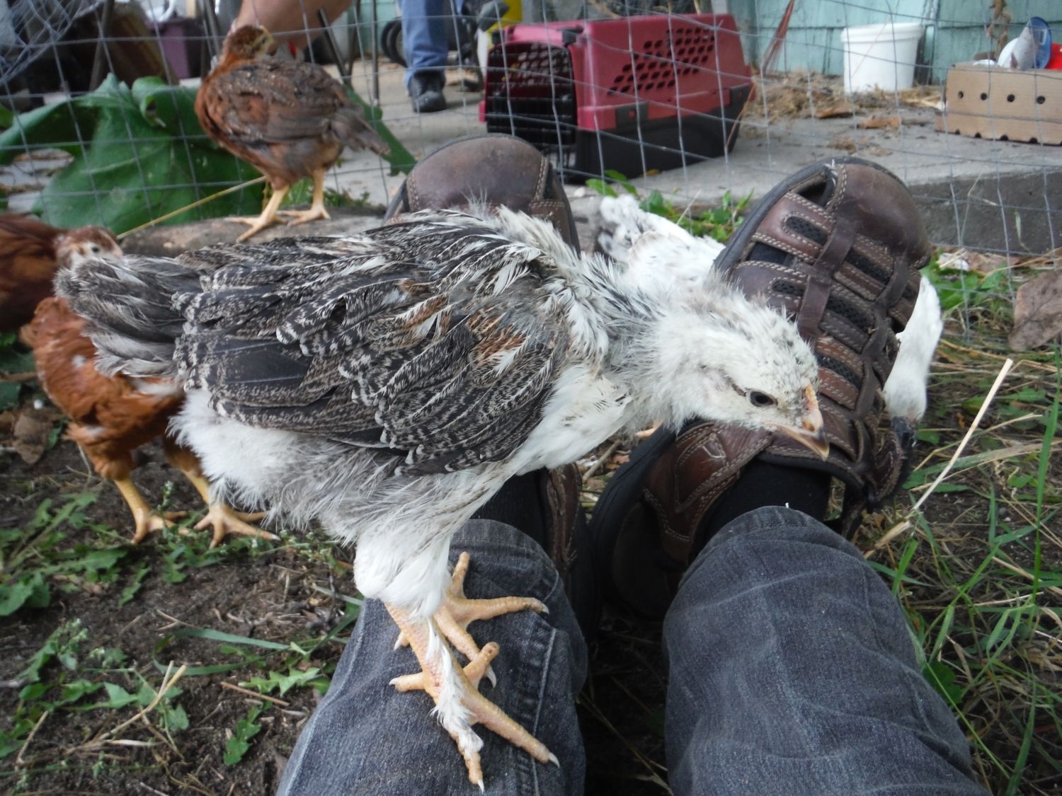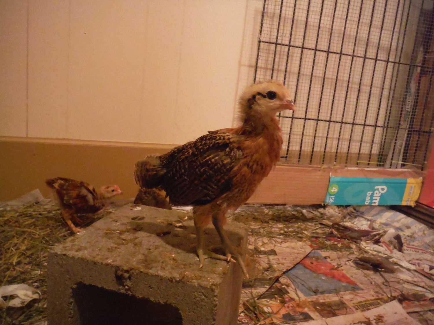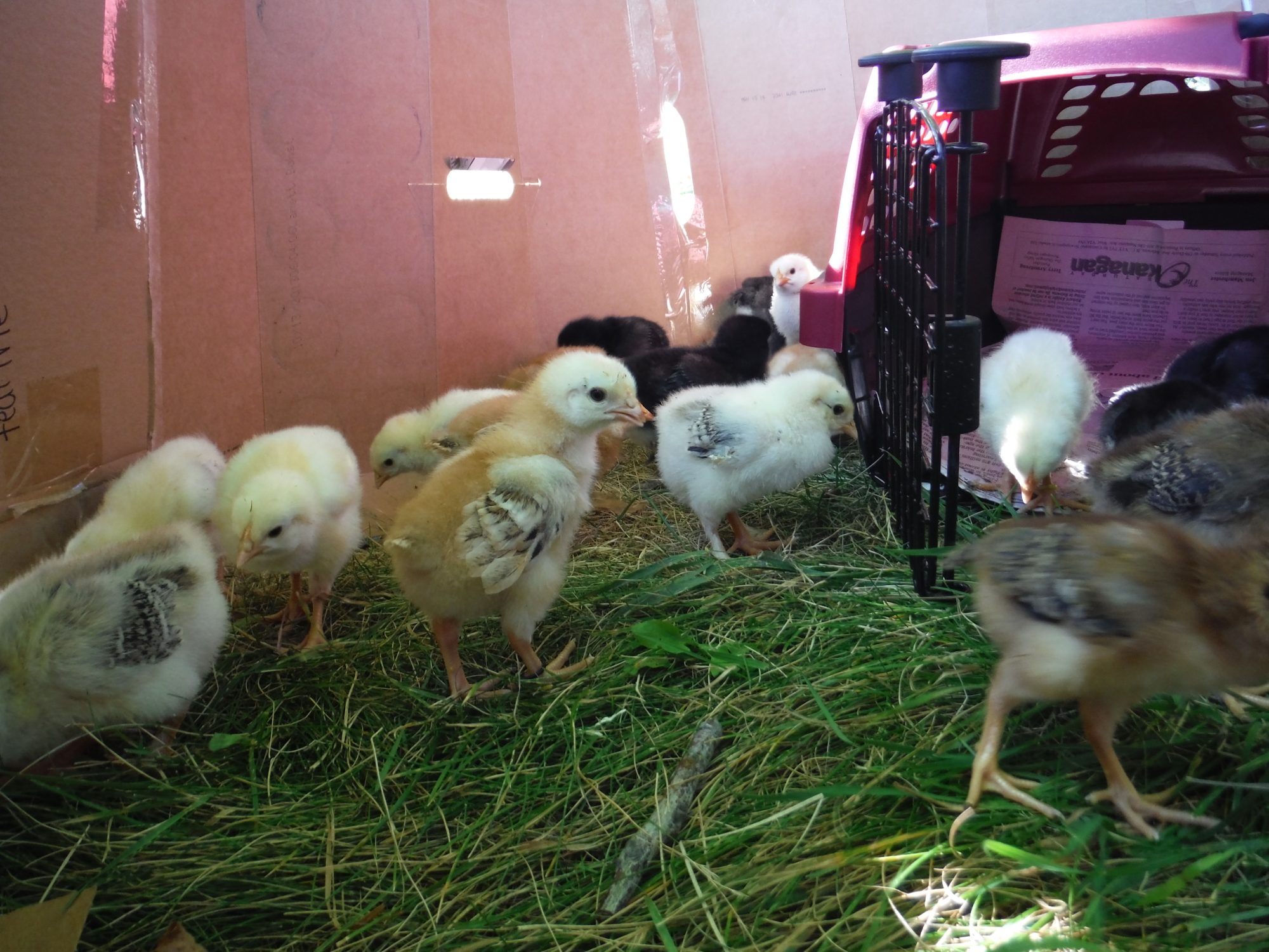 I've recently been told that Brahma, Buff Brahma, Dark Brahma, black Australorp, Danish Brown Leghorn, Sussex Red crosses, and Rock crosses are some of the breeds in the flock these chicks came from. So excited still to see what they all turn out to be. So far only a few chicks really stand out from the others and I'm crossing my fingers they are pullets. especially the one with olive legs and the tiger coloured one with fuzzy legs......actually i hope all 4 with the fuzzy legs are pullets, or at least really sociable cockerels that get along with my current head roo Chester(as in Chester Fried Chicken. Not sure if that's just a Canadian chain or not hah)