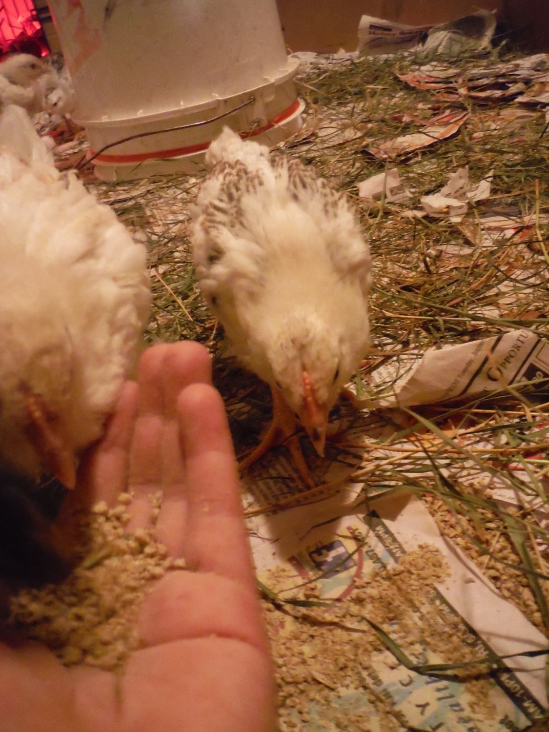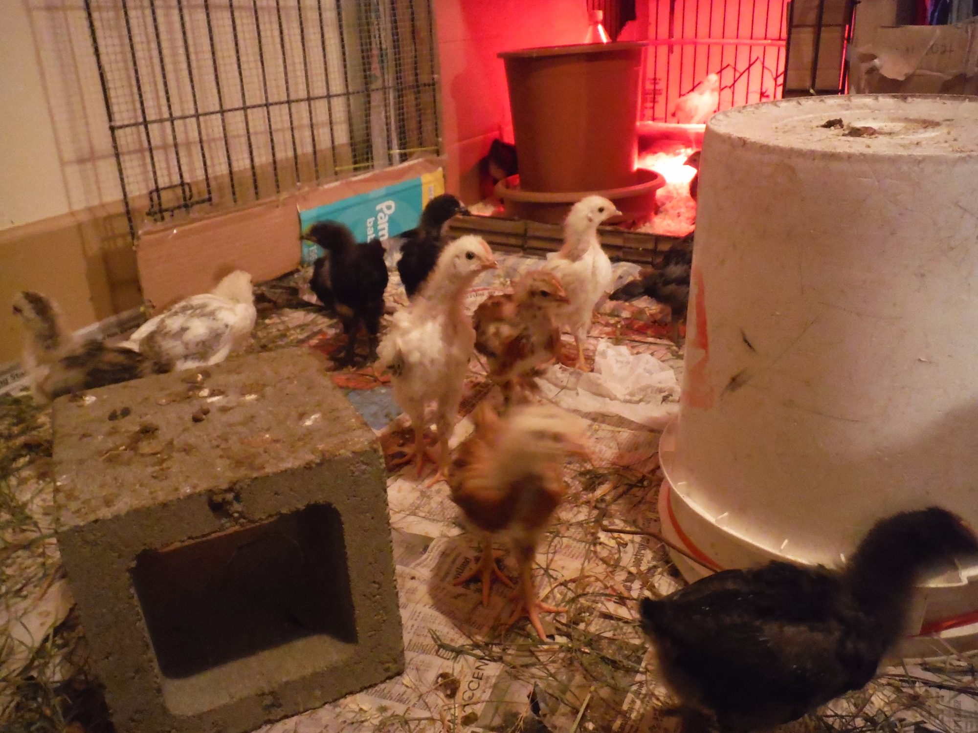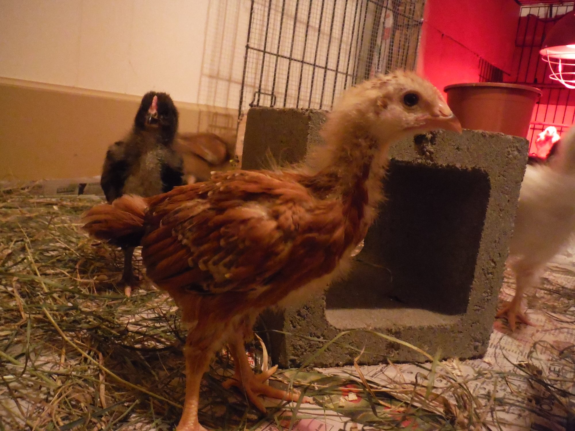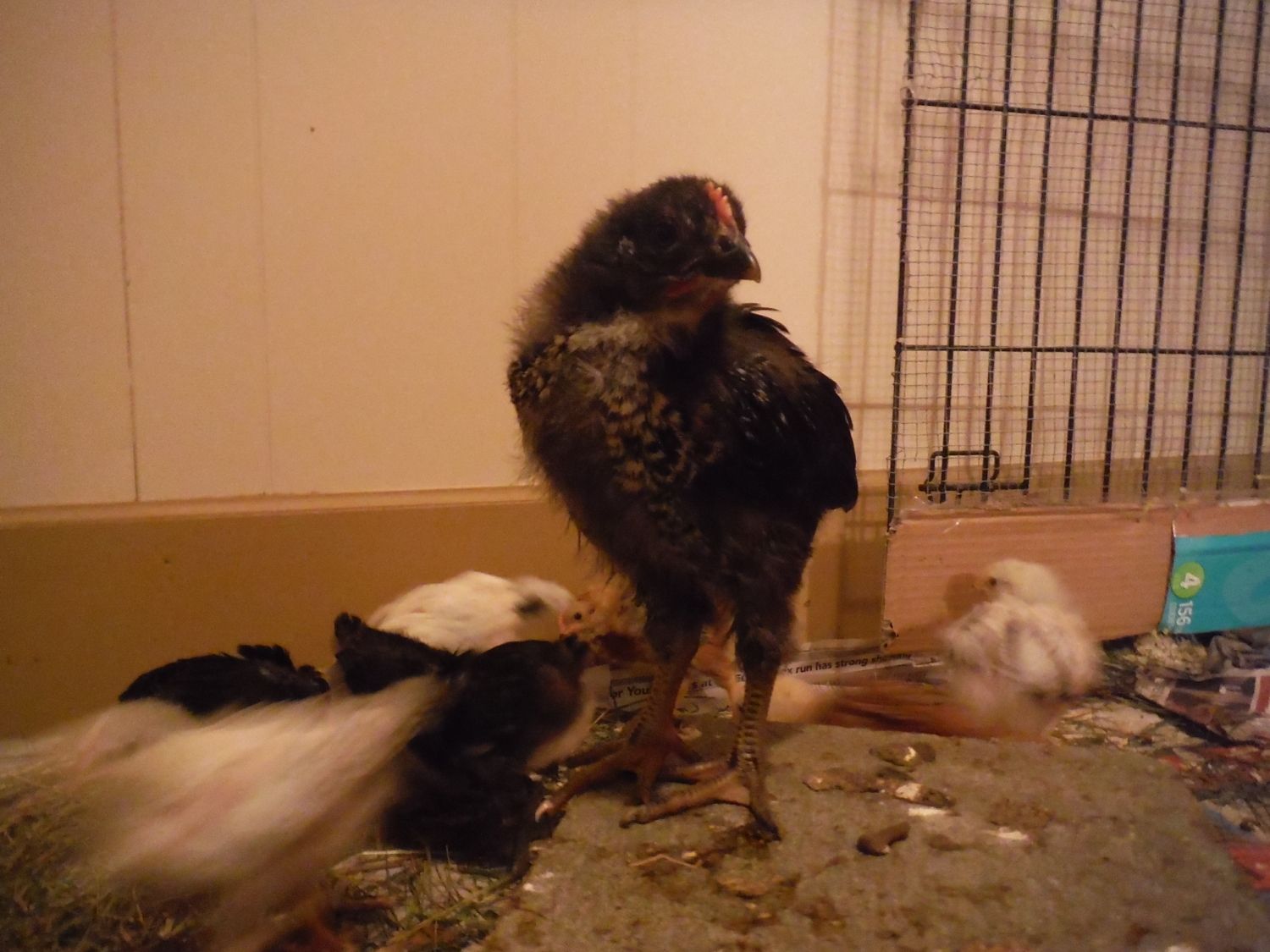 I've recently been told that Brahma, Buff Brahma, Dark Brahma, black Australorp, Danish Brown Leghorn, Sussex Red crosses, and Rock crosses are some of the breeds in the flock these chicks came from. So excited still to see what they all turn out to be. So far only a few chicks really stand out from the others and I'm crossing my fingers they are pullets. especially the one with olive legs and the tiger coloured one with fuzzy legs......actually i hope all 4 with the fuzzy legs are pullets, or at least really sociable cockerels that get along with my current head roo Chester(as in Chester Fried Chicken. Not sure if that's just a Canadian chain or not hah)