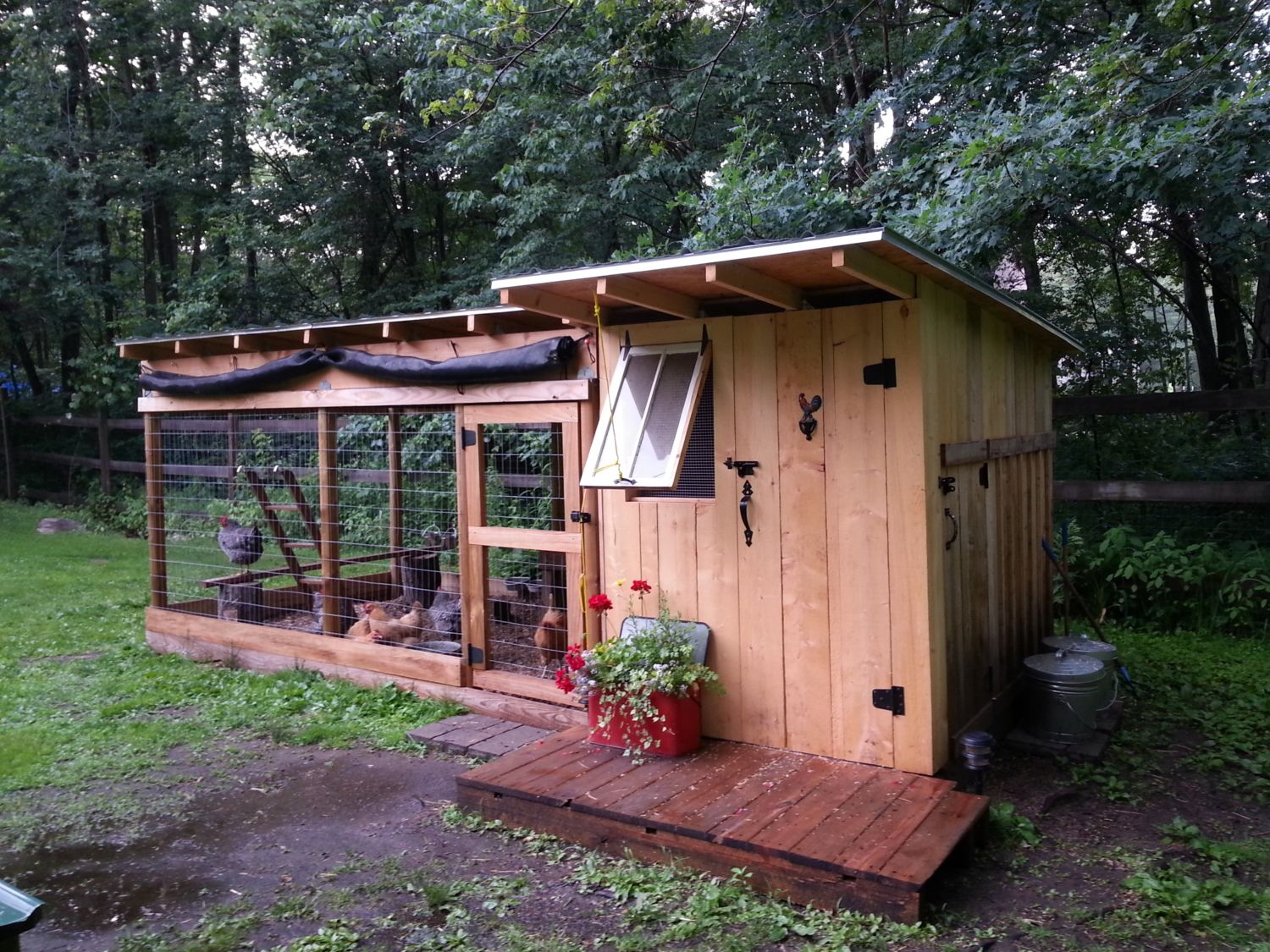 It was too hot to keep them inside the coop this afternoon, and as it got dark they all were trying to roost on the run. I thought about trying to catch them and put them back in the coop, but I figured they had enough stress for one day. So, I laid a board across the run and they all hopped on it for the night.