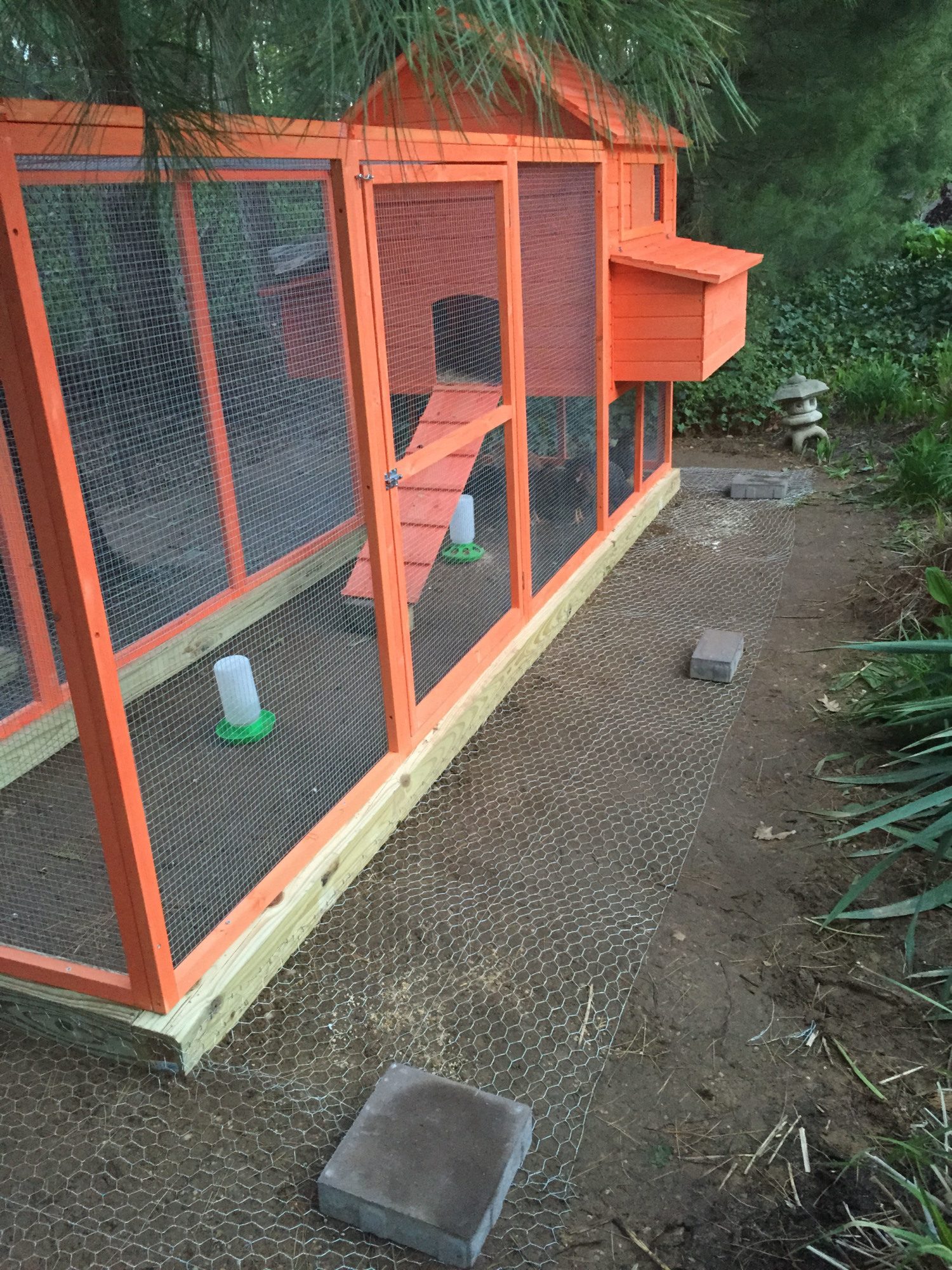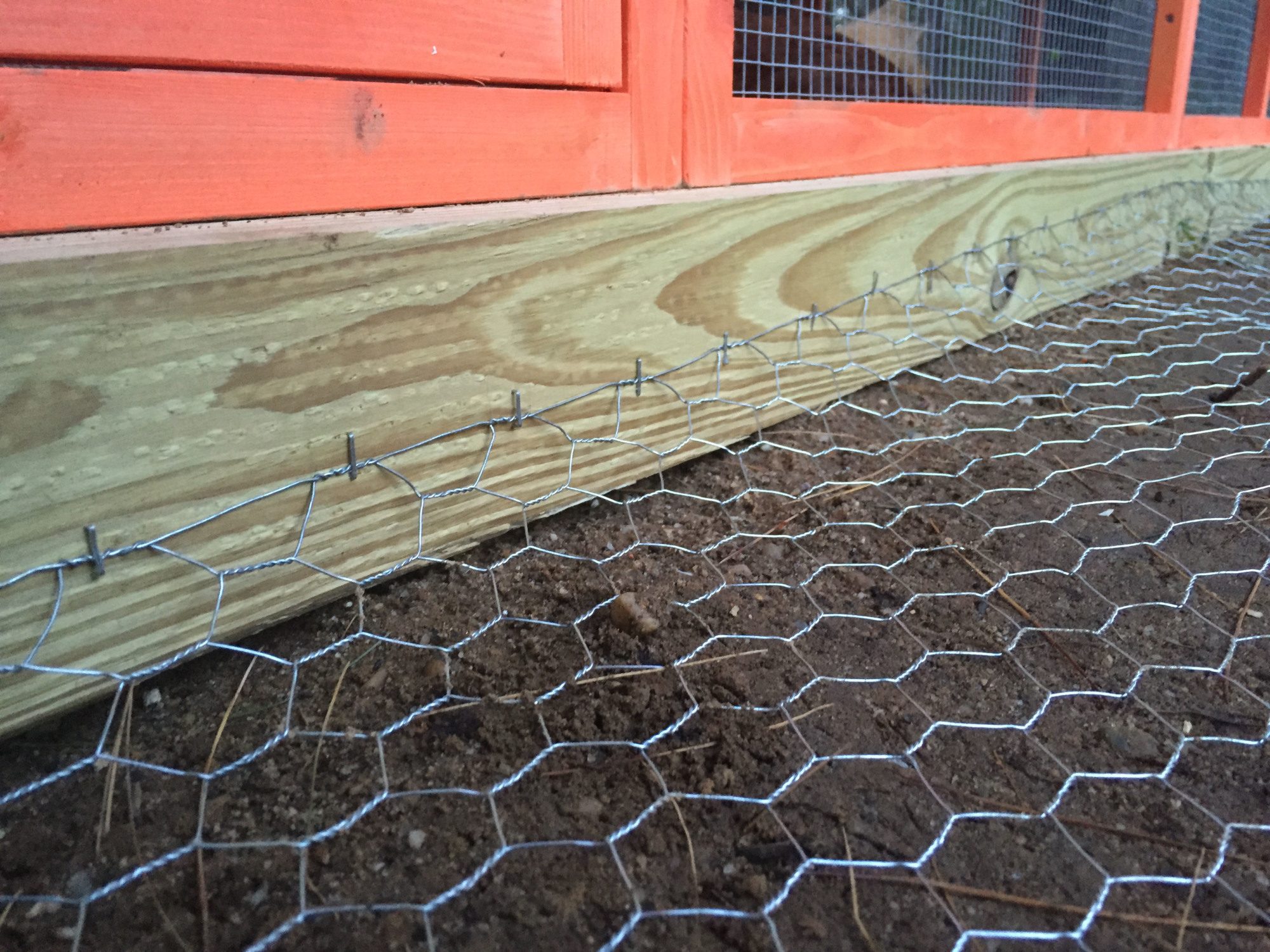I also stapled chicken wire to the 4x4s around the entire perimeter approximately 2 feet out. Hopefully this will help with predators wanting to burrow. I will keep my fingers crossed.