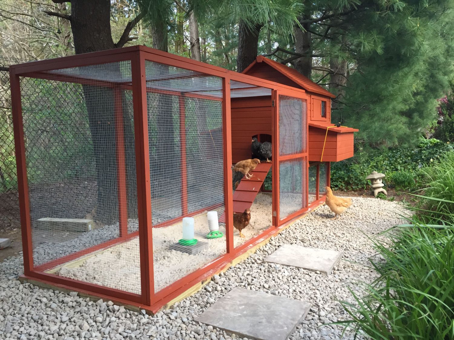 Photo 3: This is a photo of the completed coop with some of the girls (we hope the are hens) hanging around. I placed some stepping stones and river pebbles around the perimeter of the coop and on top of the chicken wire to hopefully further prevent predators from burrowing. I was told that the buried chicken wire and stones on top should help with predators.